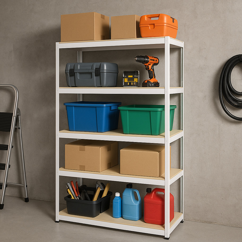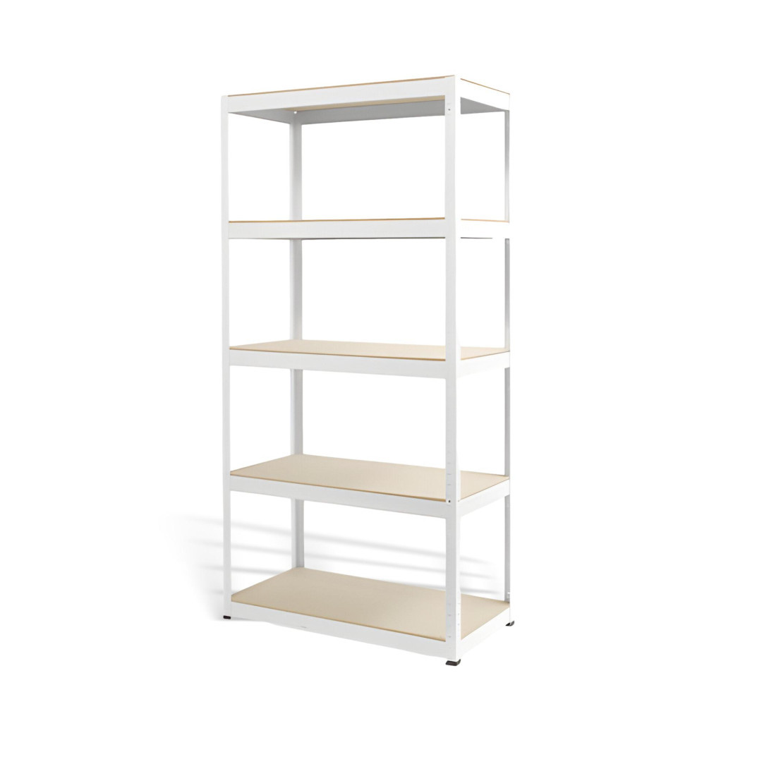 Bezšroubový policový regál MAMUT je velmi praktický, jednoduchý regál, který využijete ve skladu, archivu, garáži, šatně, spíži či kanceláři. Dokážete si jej složit i sami. Tvoří jej pevná ocelová konstrukce a 5 polic z dřevotřísky, které jsou umístěny na stabilních ocelových nosnících. Vyztužené police jsou vyrobeny z kvalitní dřevotřísky o tloušťce 8 mm, každá s nosností do 170 kg. Tento policový regál je dostupný v bílém provedení.