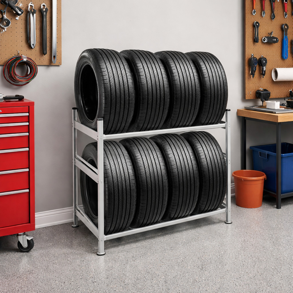 Udělejte si ve své garáži pořádek a získejte více prostoru s praktickým regálem na pneumatiky. Model o šířce 1060 mm a výšce 1100 mm nabízí dostatek místa až pro 8 pneumatik, takže je budete mít vždy přehledně uložené a připravené na další sezónu.