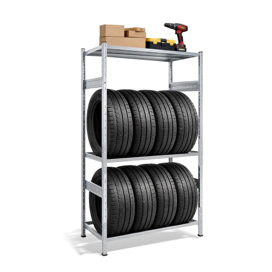 Konstrukce regálu je navržena tak, aby spodní i střední část sloužily přímo k uložení pneumatik. Pevný rám je spolehlivě drží na místě, takže se neposouvají a zůstávají stabilně uložené. V horní části se nachází praktická police, ideální pro uložení nářadí, autodoplňků, olejů, čisticích prostředků nebo jiného vybavení do garáže.