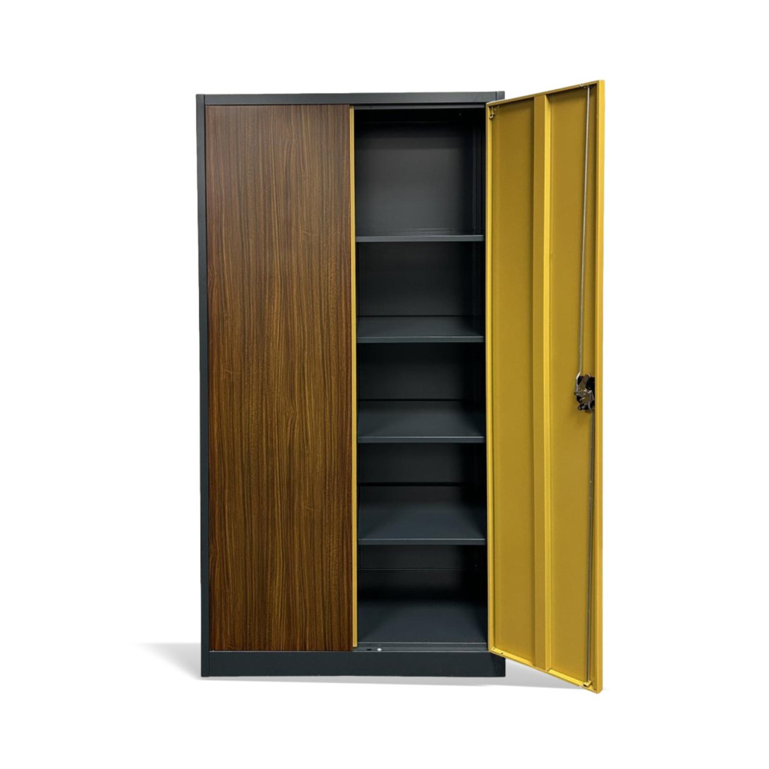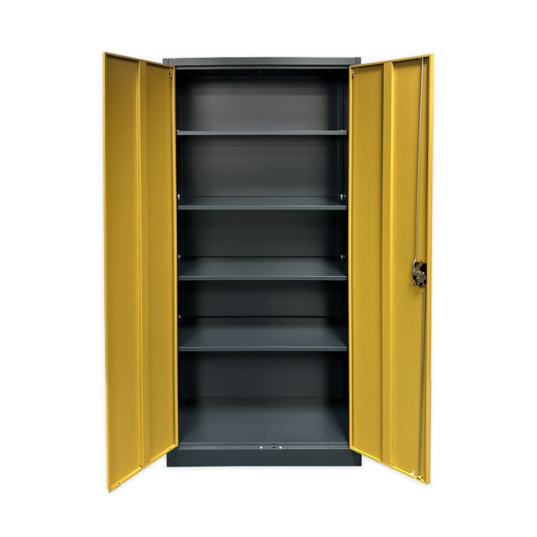 Skříň je vyrobena z ocelového plechu o tloušťce 0,6 mm, takže se můžete spolehnout na její stabilitu a dlouhou životnost. Dveře se otevírají až do úhlu 110°, což znamená pohodlný přístup ke všemu, co máte uložené uvnitř. Navíc jsou po celé délce vyztuženy dvojitou výztuhou, takže zvládnou i každodenní intenzivní používání. A když je otevřete, čeká vás příjemné překvapení – vnitřní strana dveří v moderním žlutém odstínu, která dodává skříni energii a zpříjemňuje její používání.