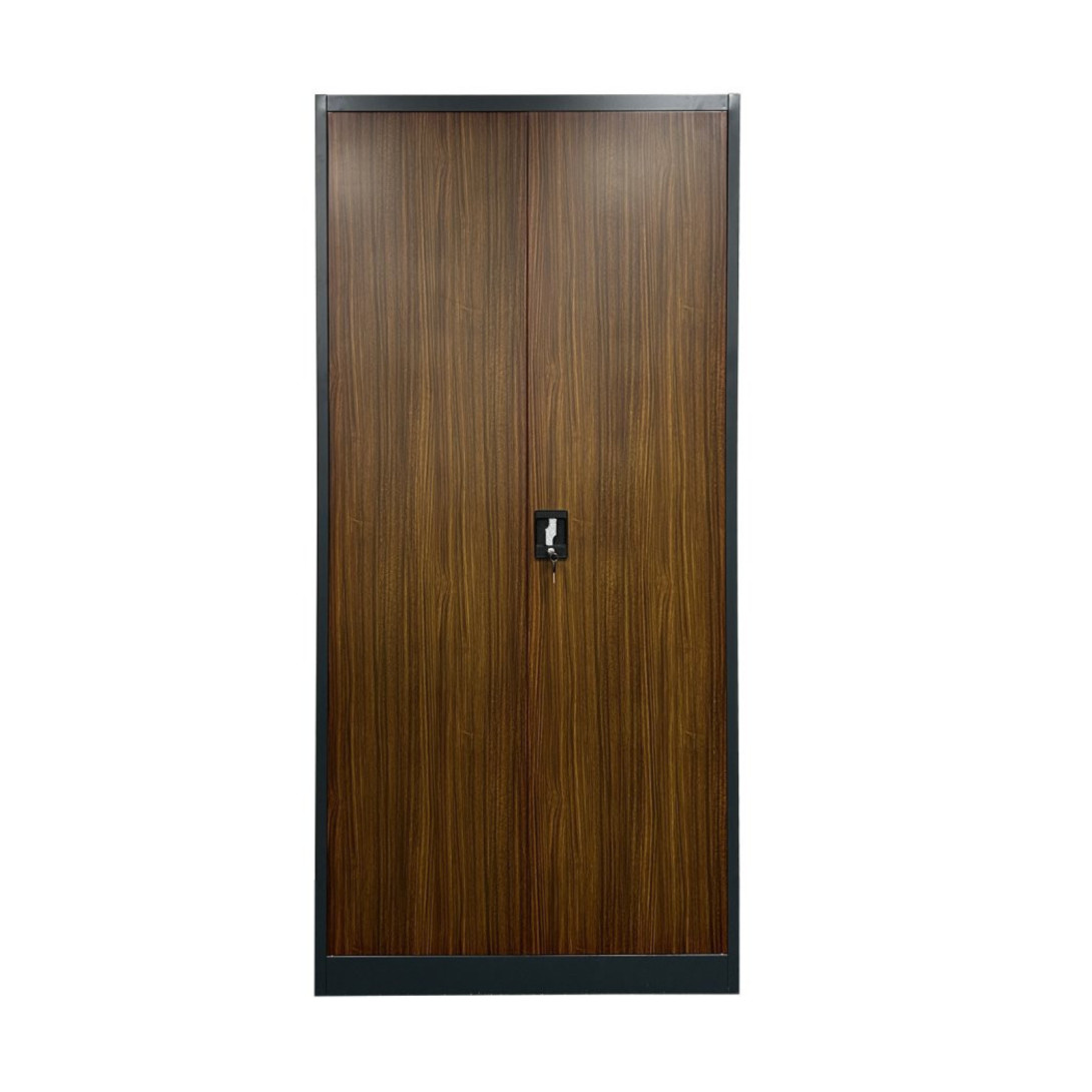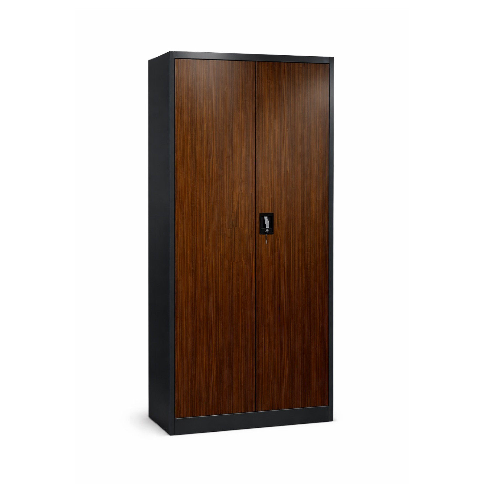 Tato kovová kancelářská skříň je důkazem, že praktický nábytek může vypadat opravdu stylově. Pevná ocelová konstrukce v tmavém odstínu RAL 7016 se spojuje s dveřmi v imitaci tmavého dřeva a vytváří moderní kontrast, který okamžitě oživí kancelář, zasedací místnost i domácí pracovní kout. Výsledek? Elegantní kus nábytku, který působí profesionálně a zároveň příjemně.