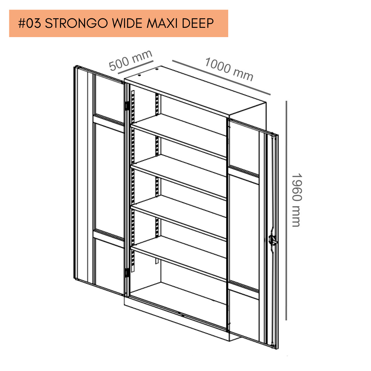 Kancelářská skříň #03 STRONGO WIDE MAXI DEEP je vyšší a hlubší, než ostatní skříně ze série #03 STRONGO. Má univerzální, klasický design, díky čemuž se dokonale hodí do jakékoli kanceláře, archivu, domácnosti nebo skladu. Díky své extra hloubce vejdou se do ní velkoobjemové krabice, šanony a dokumenty, ale také těžší kancelářské a domácí potřeby. Skříň má celosvařenou konstrukci, vyrobenou z kvalitního ocelového plechu. Díky odolnému provedení poskytuje dokonalou bezpečnost. Obsahuje 4 police s nastavitelnou výškou, s nosností 80 kg. Skříň je vybavena velkoplošným otočným zámkem se dvěma klíči.