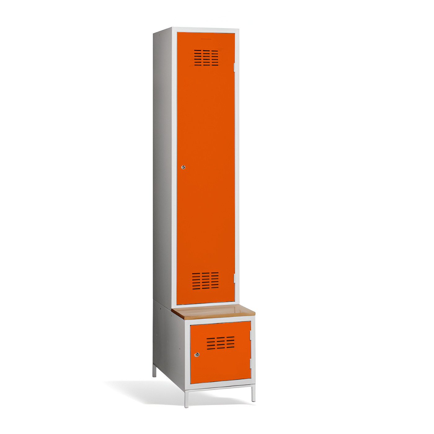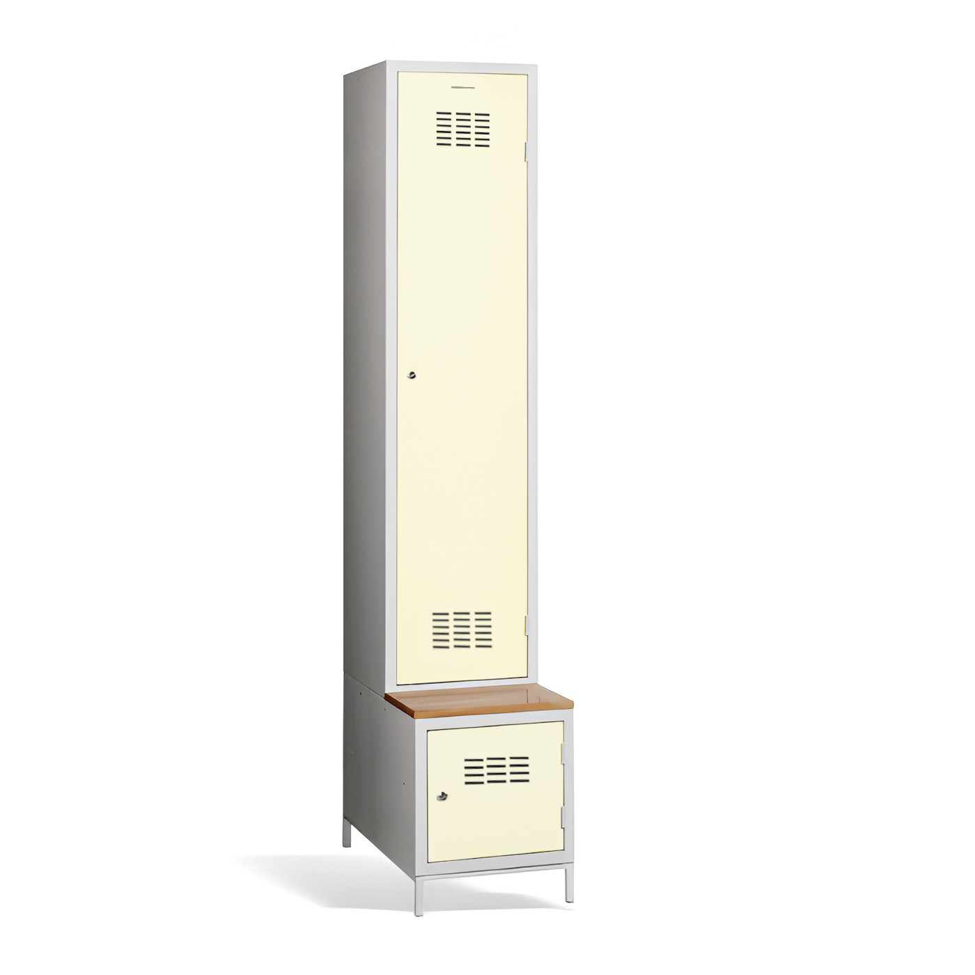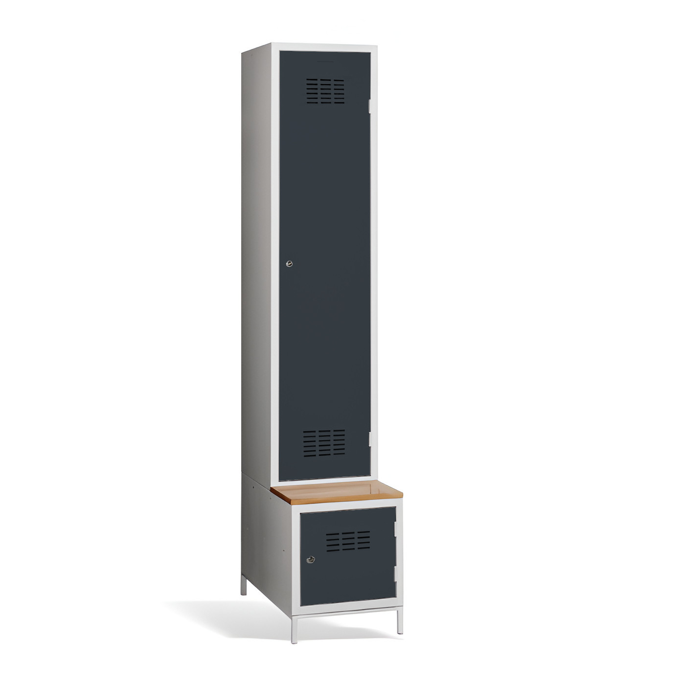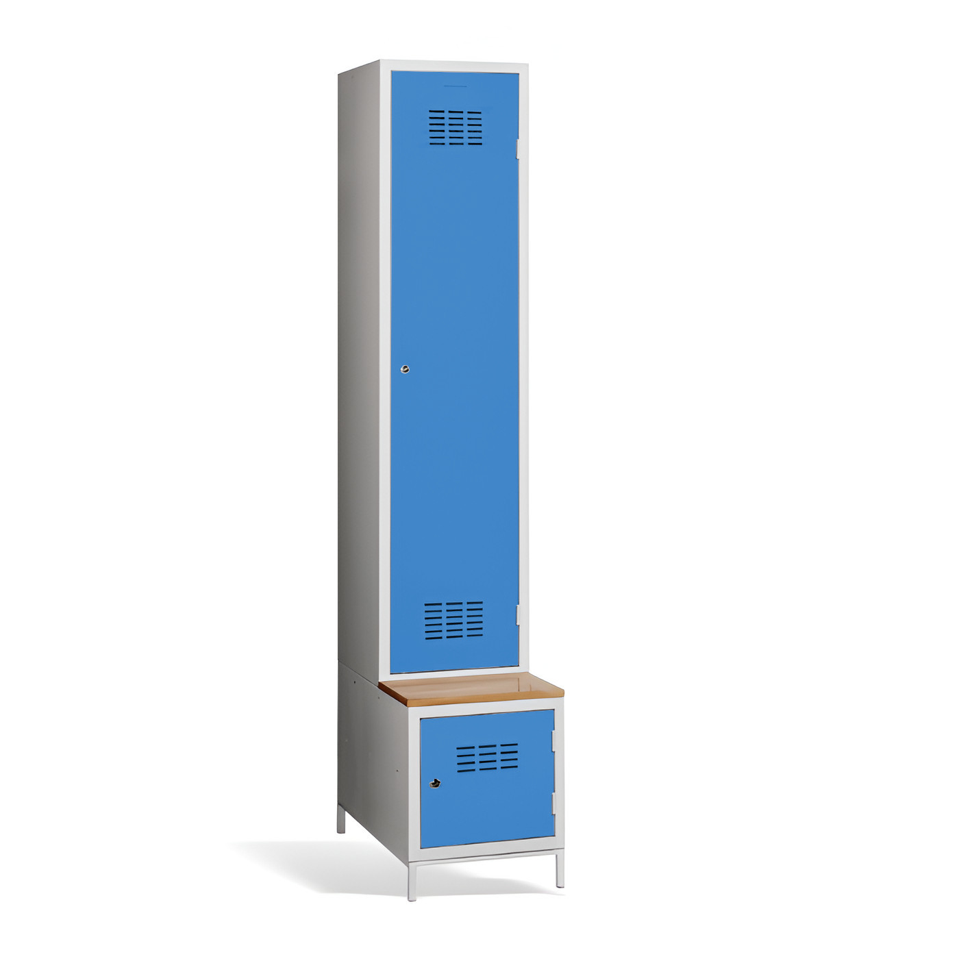 Jednodveřová šatní skříň #03 MAXI 1 PLUS s dělicí příčkou, vestavěnou lavicí a botníkem je ideálním řešením pro šatní skříň. Je to nejvhodnější řešení, které zajistí pohodlí a pořádek ve skříni. Díky přepážce ji můžete využít také k oddělení pracovního a civilního oblečení v jedné skříni. Světle šedá kovová šatní skříň má svařovanou konstrukci a je vyrobena z kvalitního ocelového plechu s povrchovou úpravou třídy 1. Šatní skříň nabízí dostatek prostoru, pohodlně do ní uložíte oblečení, doplňky a další osobní věci. Větrací otvory v horní a spodní části dveří zajišťují účinné proudění vzduchu. Skříň #03 MAXI 1 PLUS se standardně dodává s bezpečnostním cylindrickým zámkem, ale můžete si vybrat z různých typů zámků podle svých požadavků.