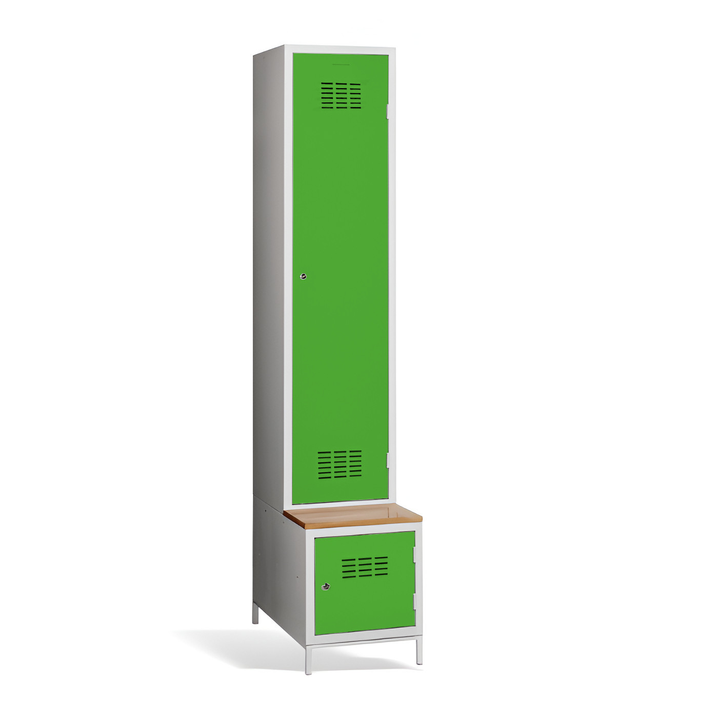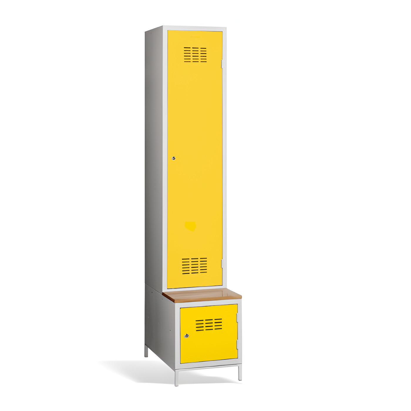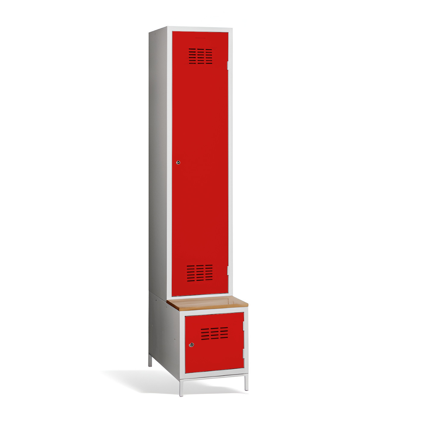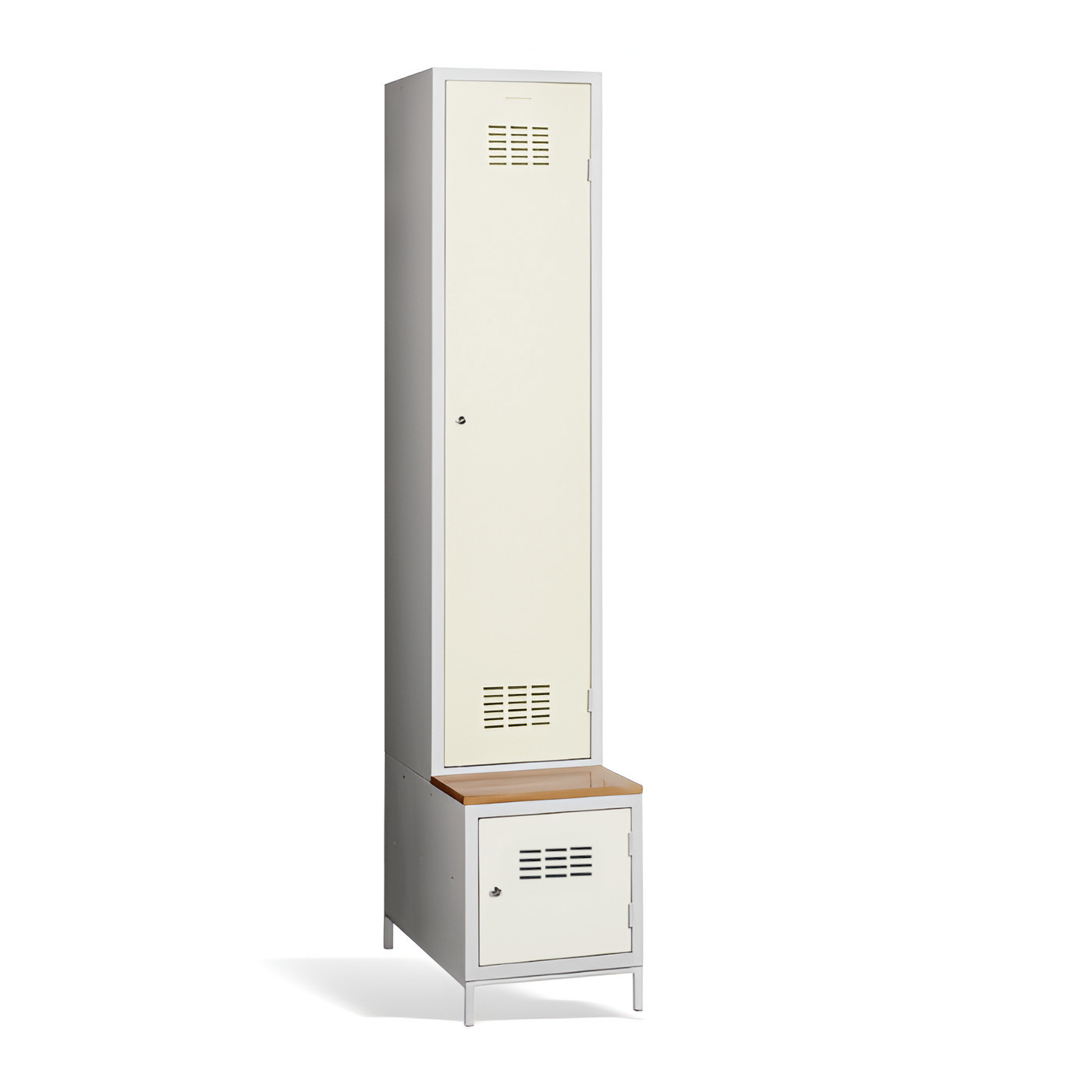 Jednodveřová šatní skříň #03 MAXI 1 PLUS s dělicí příčkou, vestavěnou lavicí a botníkem je ideálním řešením pro šatní skříň. Je to nejvhodnější řešení, které zajistí pohodlí a pořádek ve skříni. Díky přepážce ji můžete využít také k oddělení pracovního a civilního oblečení v jedné skříni. Světle šedá kovová šatní skříň má svařovanou konstrukci a je vyrobena z kvalitního ocelového plechu s povrchovou úpravou třídy 1. Šatní skříň nabízí dostatek prostoru, pohodlně do ní uložíte oblečení, doplňky a další osobní věci. Větrací otvory v horní a spodní části dveří zajišťují účinné proudění vzduchu. Skříň #03 MAXI 1 PLUS se standardně dodává s bezpečnostním cylindrickým zámkem, ale můžete si vybrat z různých typů zámků podle svých požadavků.