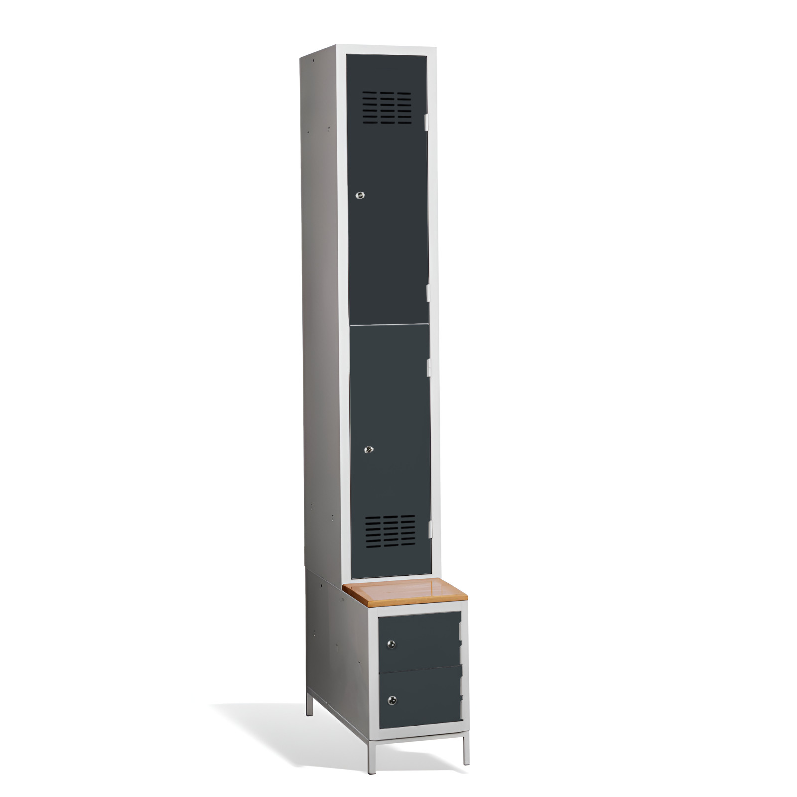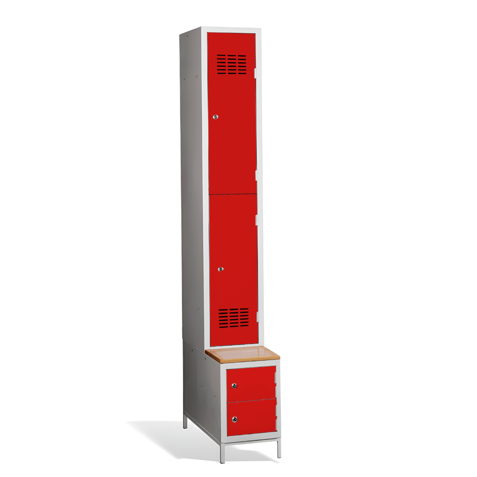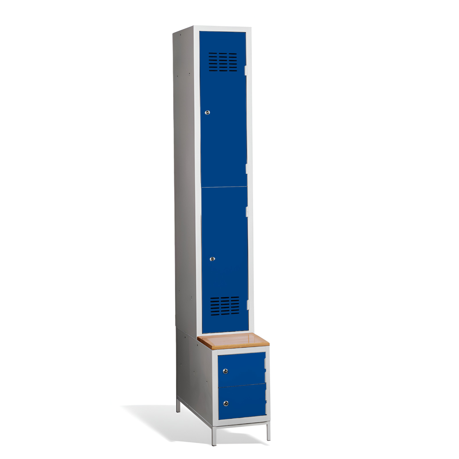 Pokud hledáte komplexní řešení pro svou šatnu, je pro vás #03 MINI 2 PLUS ideální volbou! Dvoudveřová šatní skříň s krátkými dveřmi nabízí dostatek úložného prostoru pro 2 osoby: obsahuje vestavěnou lavici a botník pro větší pohodlí a pořádek. Konstrukce skříně je svařovaná, vyrobená z kvalitního ocelového plechu s povrchovou úpravou třídy 1. Skříň #03 MINI 2 PLUS se standardně dodává s bezpečnostním cylindrickým zámkem, ale můžete si vybrat z různých typů zámků podle svých požadavků.