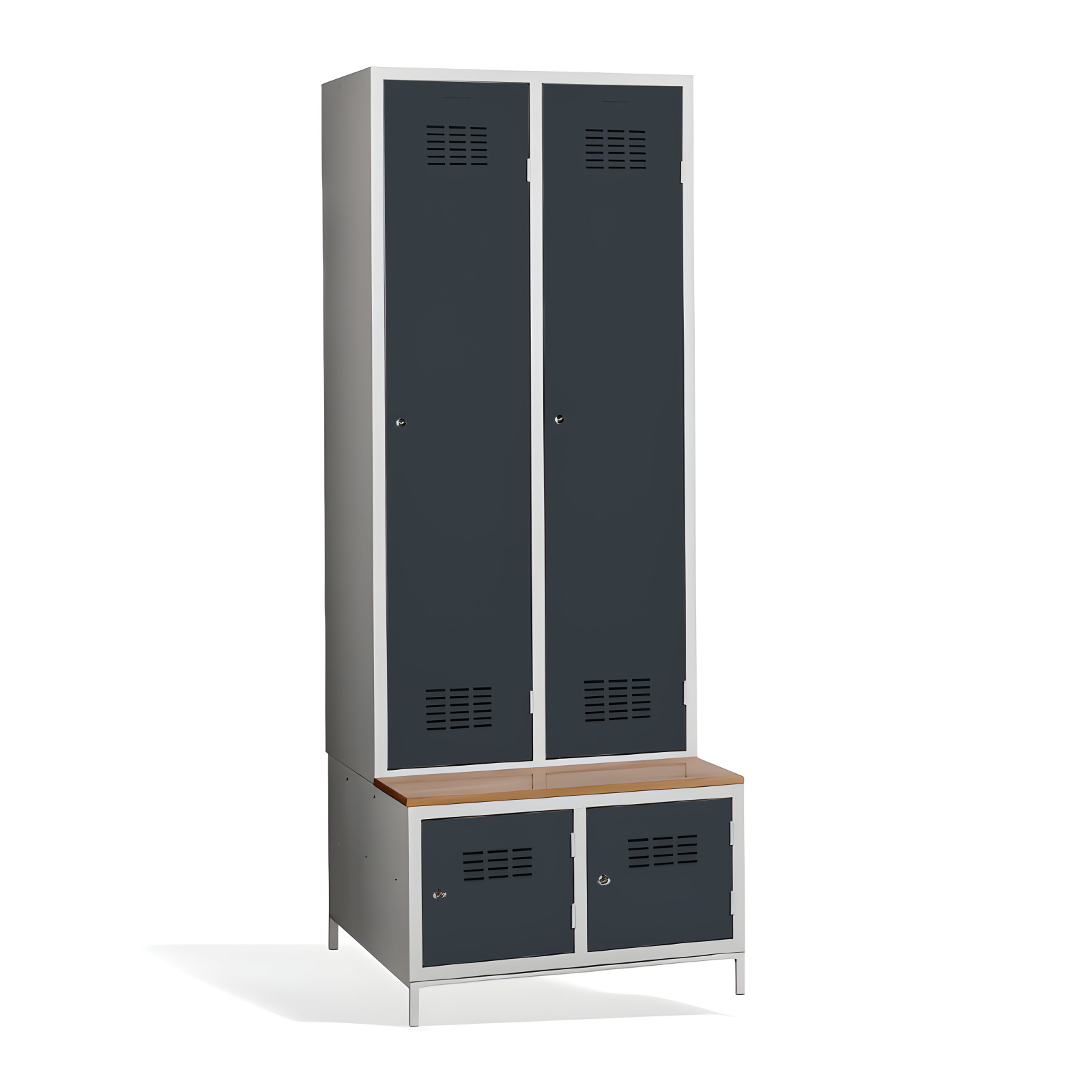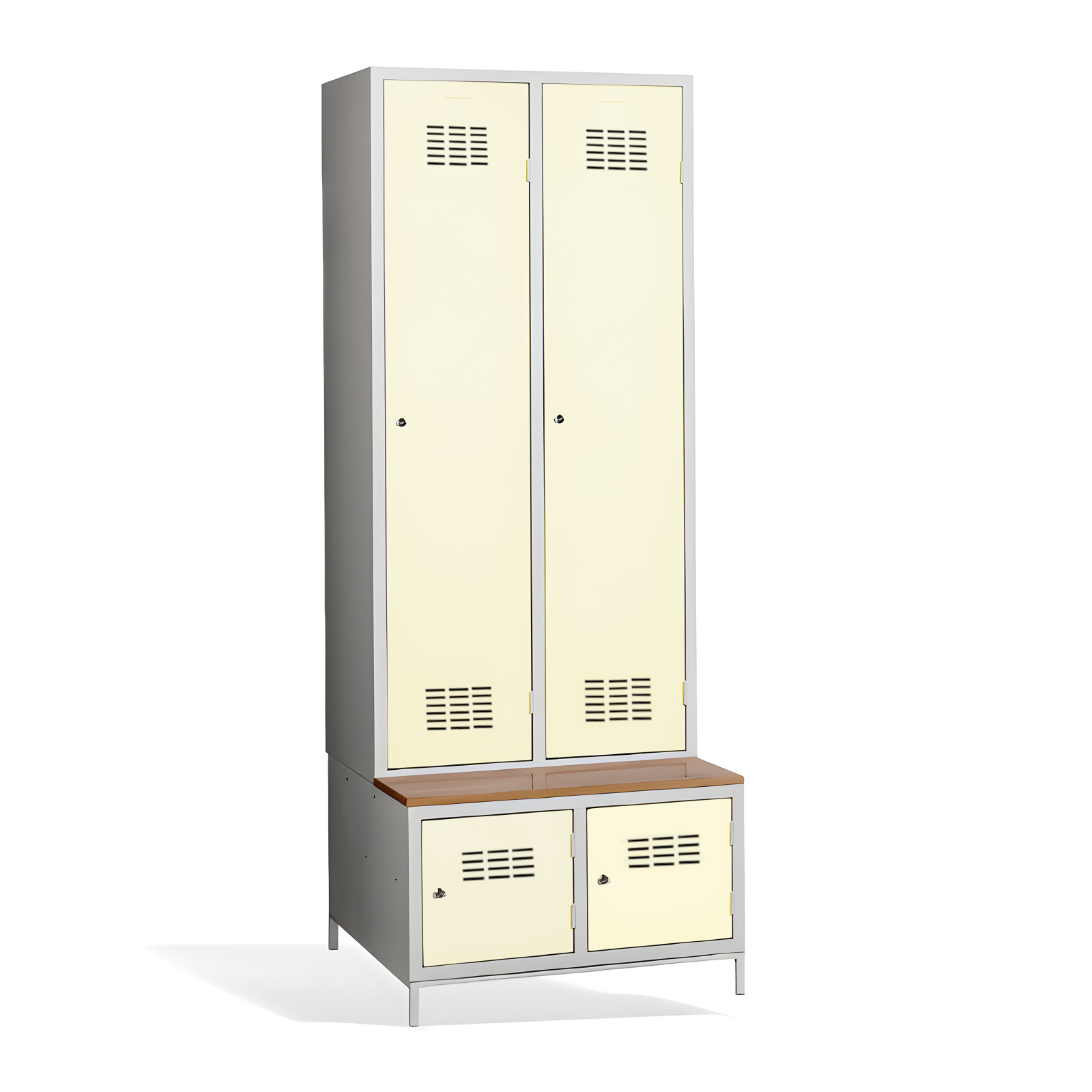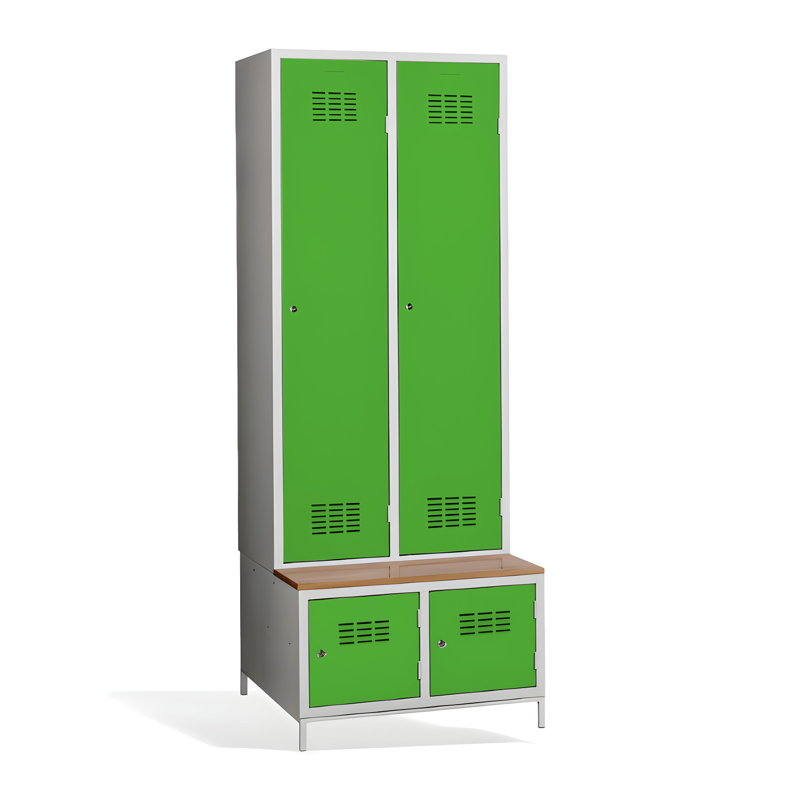 Dvoudveřová šatní skříň #03 MAXI 2 PLUS nabízí řešení 3 v 1: obsahuje 2 široké přihrádky pro uložení kabátů a cenností, vestavěnou lavici pro větší pohodlí a botník pro čistotu a pořádek. Jedná se o nejpohodlnější řešení, které zajistí pohodlí a pořádek ve vaší šatně. Díky přepážce ji můžete využít také k oddělení pracovního a civilního oblečení v jedné skříni. Kovová šatní skříň má svařovanou konstrukci, je vyrobena z vysoce kvalitního ocelového plechu 1. jakosti s povrchovou úpravou. Skříň nabízí dostatek prostoru, můžete do ní pohodlně uložit oblečení, doplňky a další osobní věci. Větrací otvory v horní a spodní části dveří zajišťují účinné proudění vzduchu. Skříň #03 MAXI 2 PLUS se standardně dodává s bezpečnostním cylindrickým zámkem, ale můžete si vybrat z různých typů zámků podle svých požadavků.