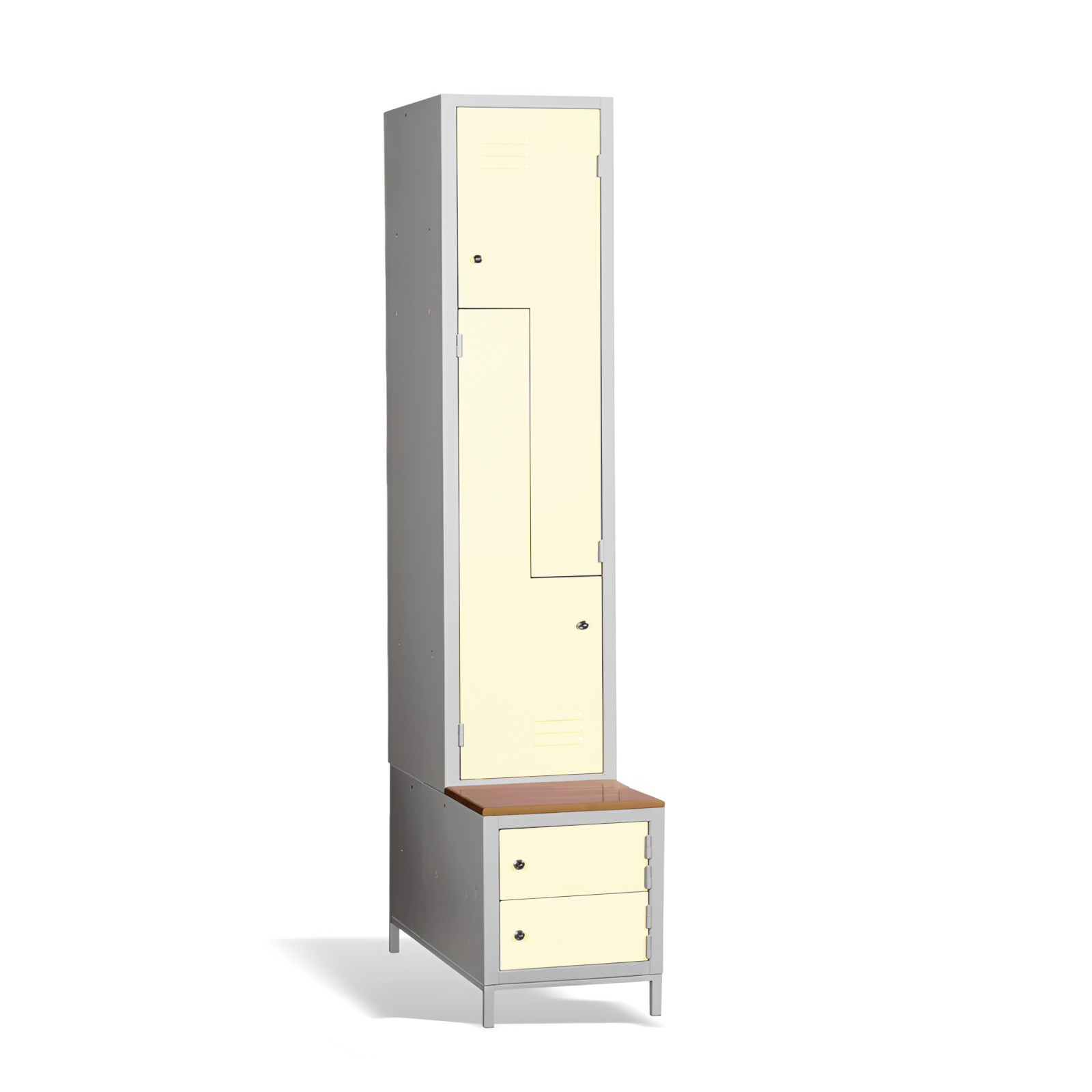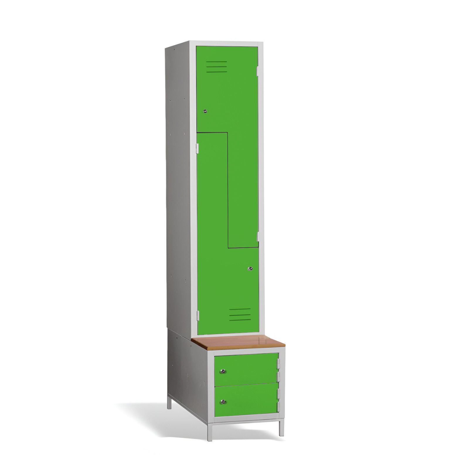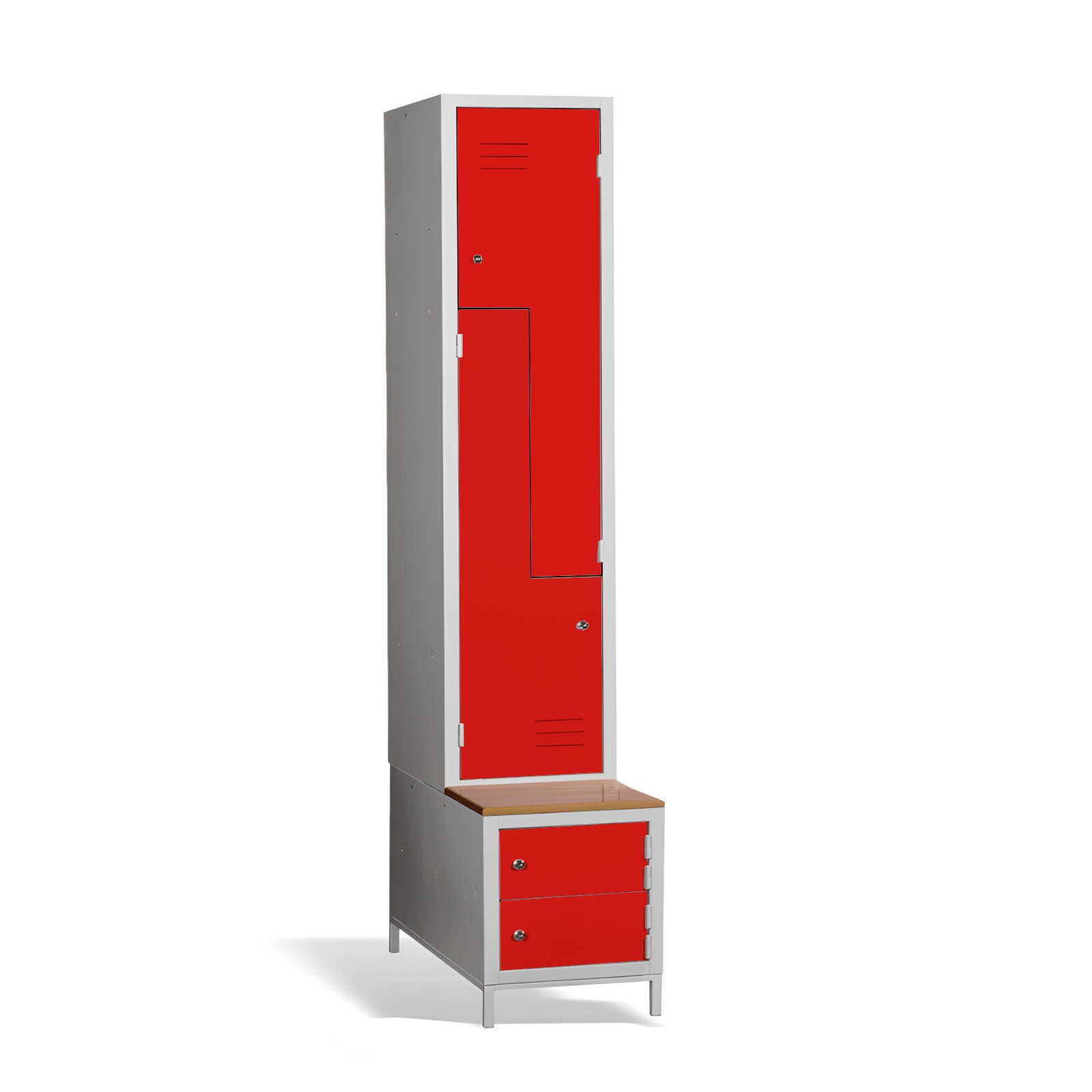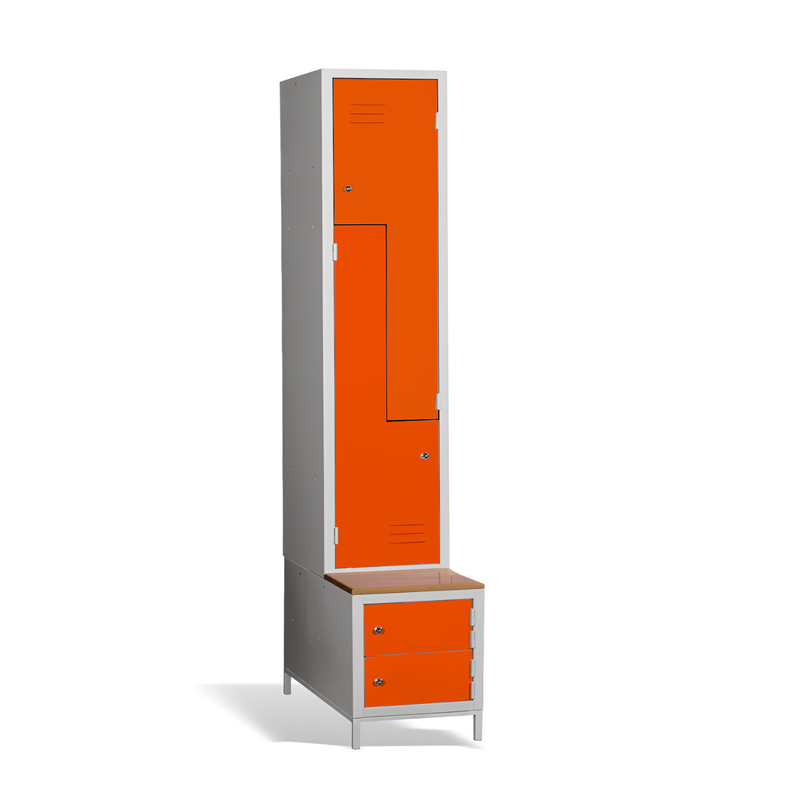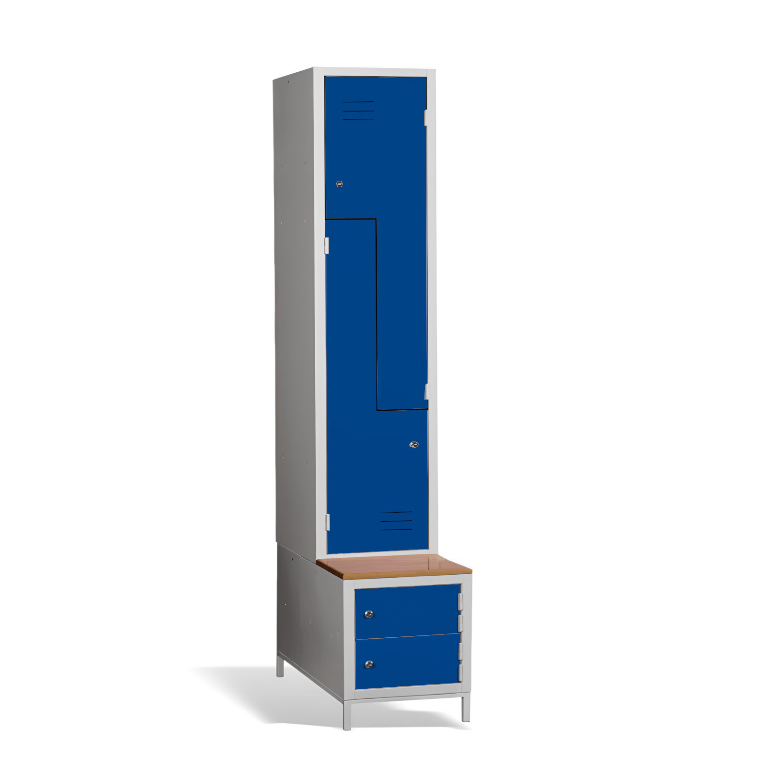 Dvoudveřová šatní skříň s dveřmi ve tvaru Z, vestavěnou lavicí a skříňkami na boty je nejvhodnějším řešením, které zajistí pohodlí a pořádek ve skříni. Konstrukce skříně je svařovaná, vyrobená z kvalitního ocelového plechu s povrchovou úpravou třídy 1. Konstrukce šatní skříně ve tvaru písmene Z je prostorově úsporná, a přitom poskytuje dostatečný komfort. Tato šatní skříň je ideální volbou pro šatnu ve škole, podniku nebo sportovním zařízení. Šatní skříň #03 CIK-CAK MAXI 2 PLUS je standardně dodávána s bezpečnostním cylindrickým zámkem, ale můžete si vybrat z různých typů zámků podle svých potřeb.