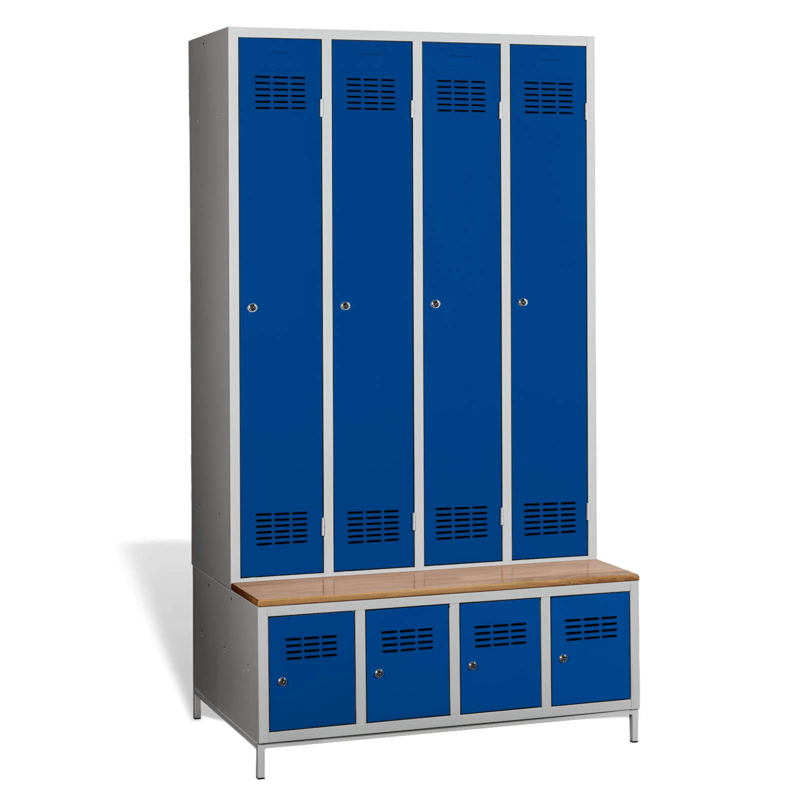 4-dveřová šatní skříň #03 STANDARD 4 PLUS je perfektním řešením do Vaší šatny. Pohodlná zabudovaná lavice poskytuje maximální komfort při převlékání, přičemž skříňka na obuv zajišťuje efektivní organizaci a pořádek. Kovová skříň má svařovanou konstrukci, je vyrobena z kvalitního ocelového plechu 1. třídy s povrchovou úpravou. Skříň nabízí dostatečný prostor, pohodlně si do ní uložíte oblečení, doplňky a jiné osobní předměty. Větrací otvory v horní a dolní části dveří zajišťují efektivní proudění vzduchu. #03 STANDARD 4 PLUS standardně dodáváme s bezpečnostním cylindrickým zámkem, ale můžete si vybrat z různých typů zámků dle vlastního přání.