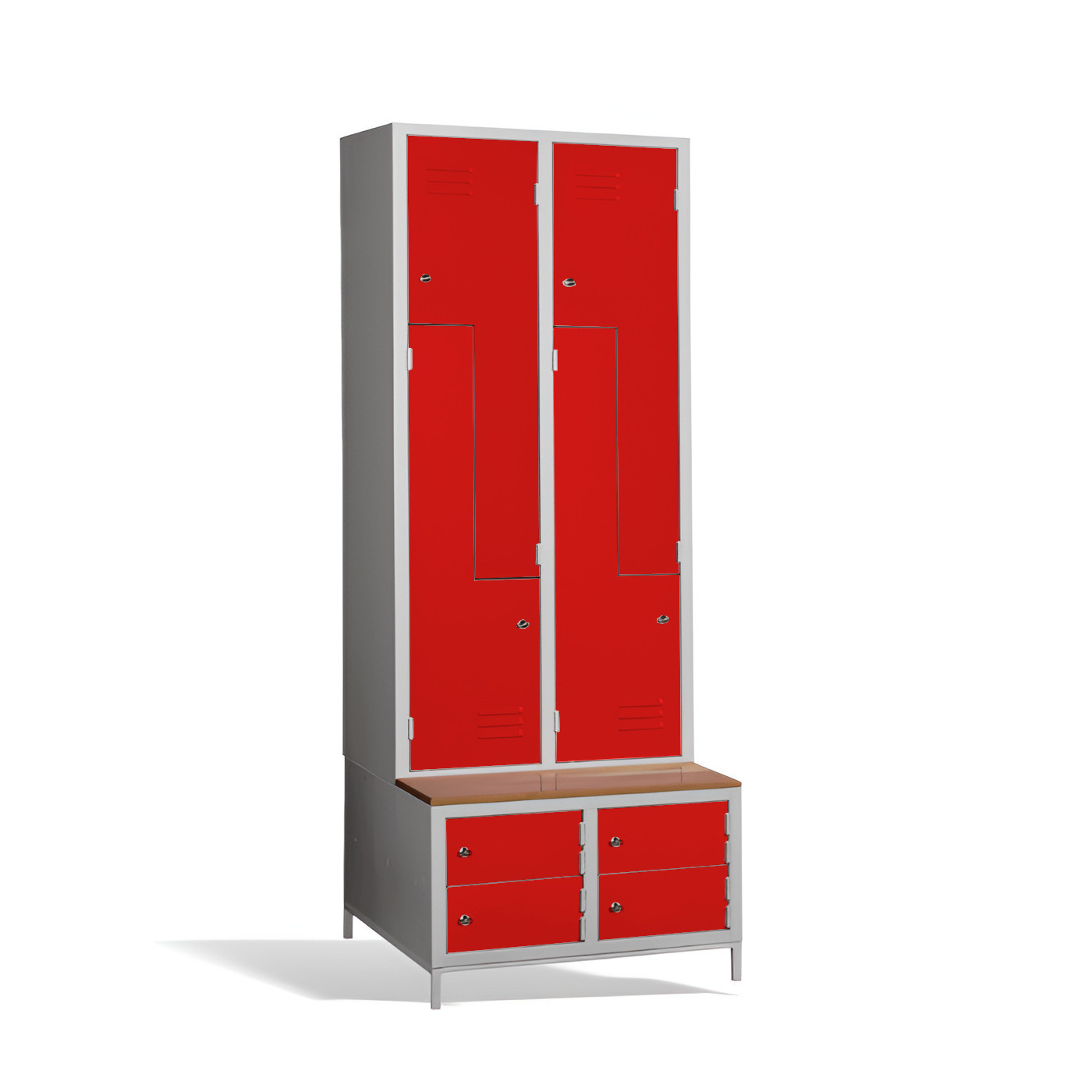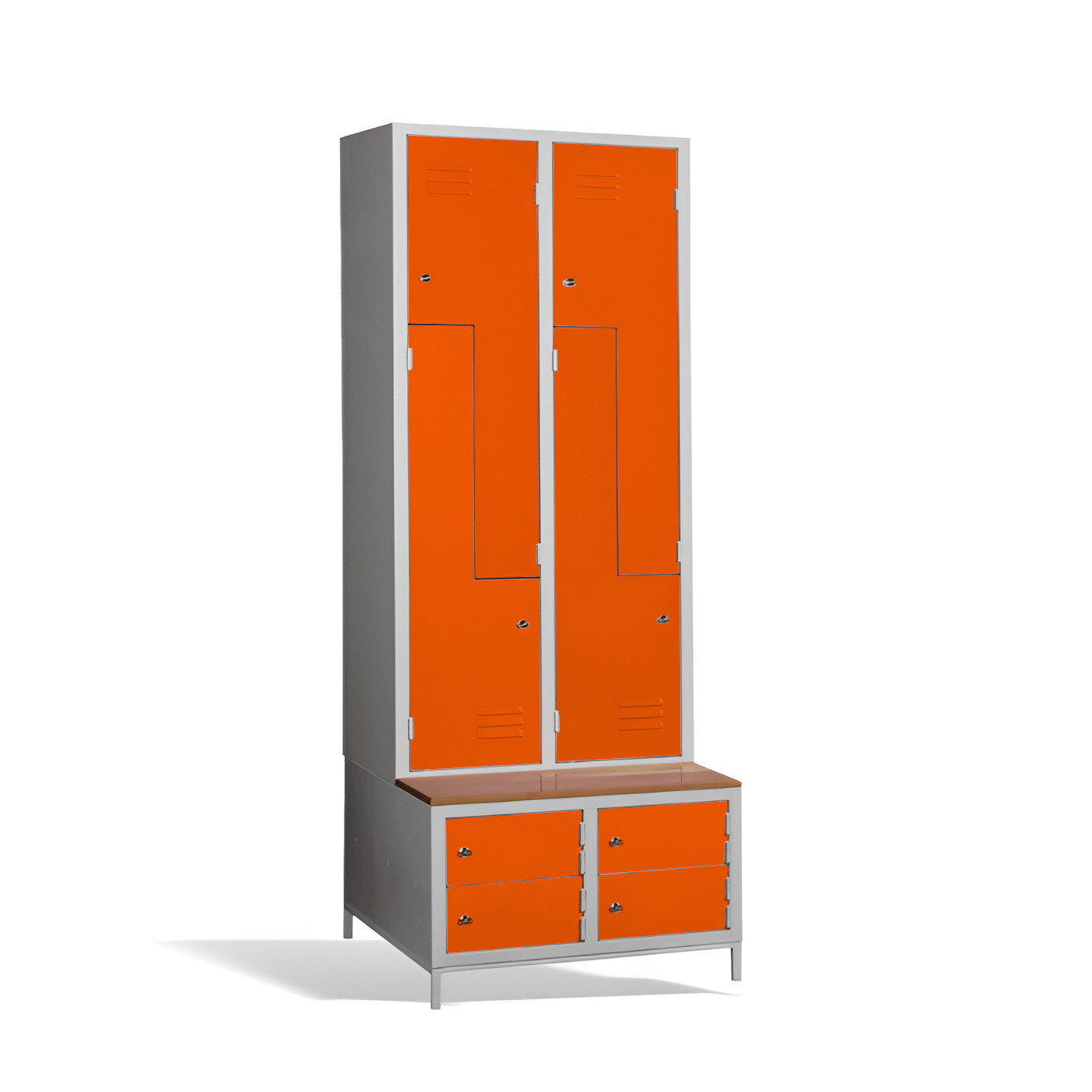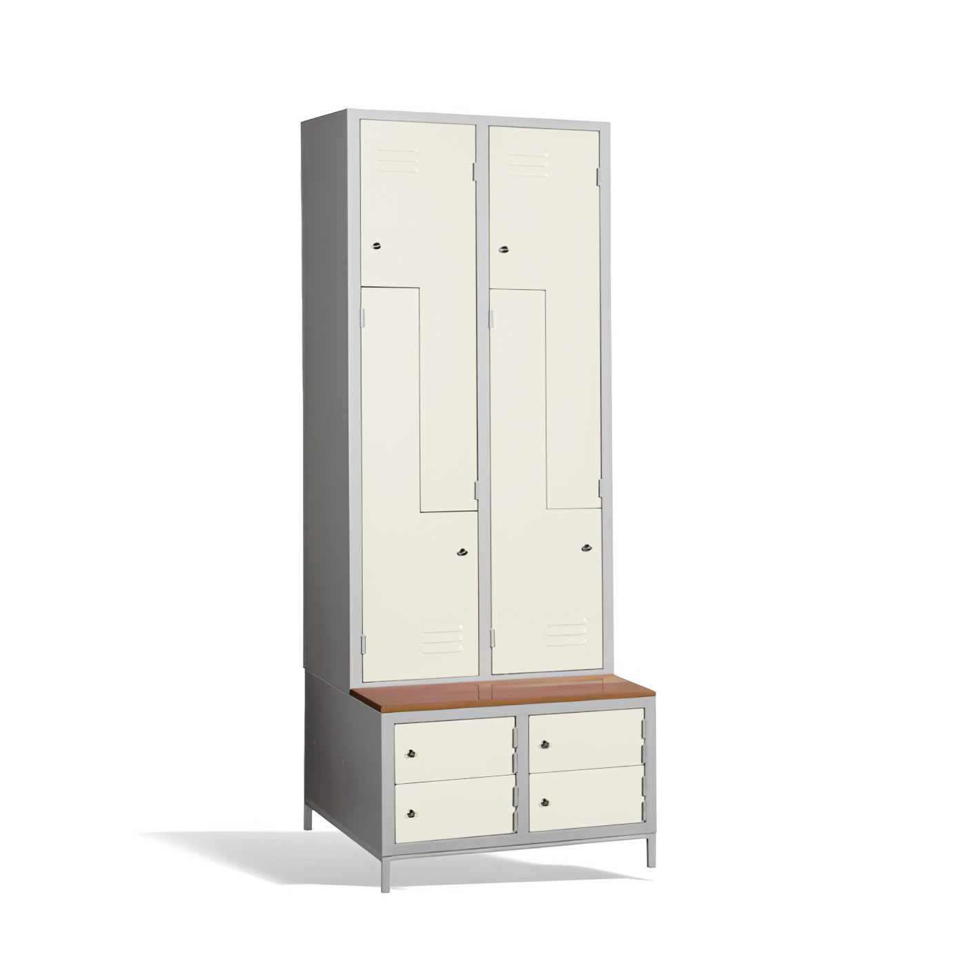 Čtyřdveřová šatní skříň ve tvaru Z s vestavěnou lavicí a skříňkami na boty je ideálním řešením pro šatnu. Je to nejpohodlnější řešení, které zajistí pohodlí a pořádek v šatně. Konstrukce skříně je svařovaná, vyrobená z kvalitního ocelového plechu s povrchovou úpravou třídy 1. Konstrukce šatní skříně ve tvaru písmene Z je prostorově úsporná, a přitom poskytuje dostatečný komfort. Tato skříňka je ideální volbou pro šatnu ve škole, podniku nebo sportovním zařízení. Skříňka #03 CIK-CAK MAXI 4 PLUS je standardně dodávána s bezpečnostním cylindrickým zámkem, ale můžete si vybrat z různých typů zámků podle svých potřeb.