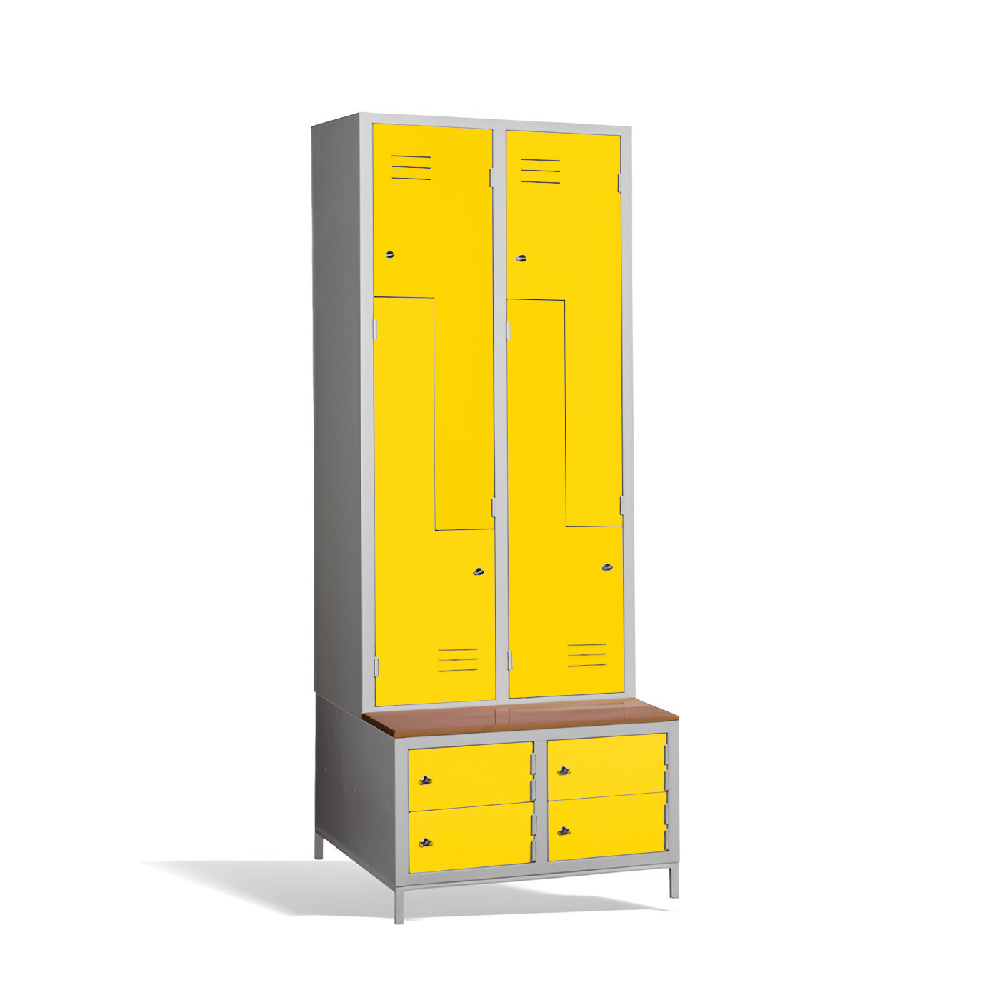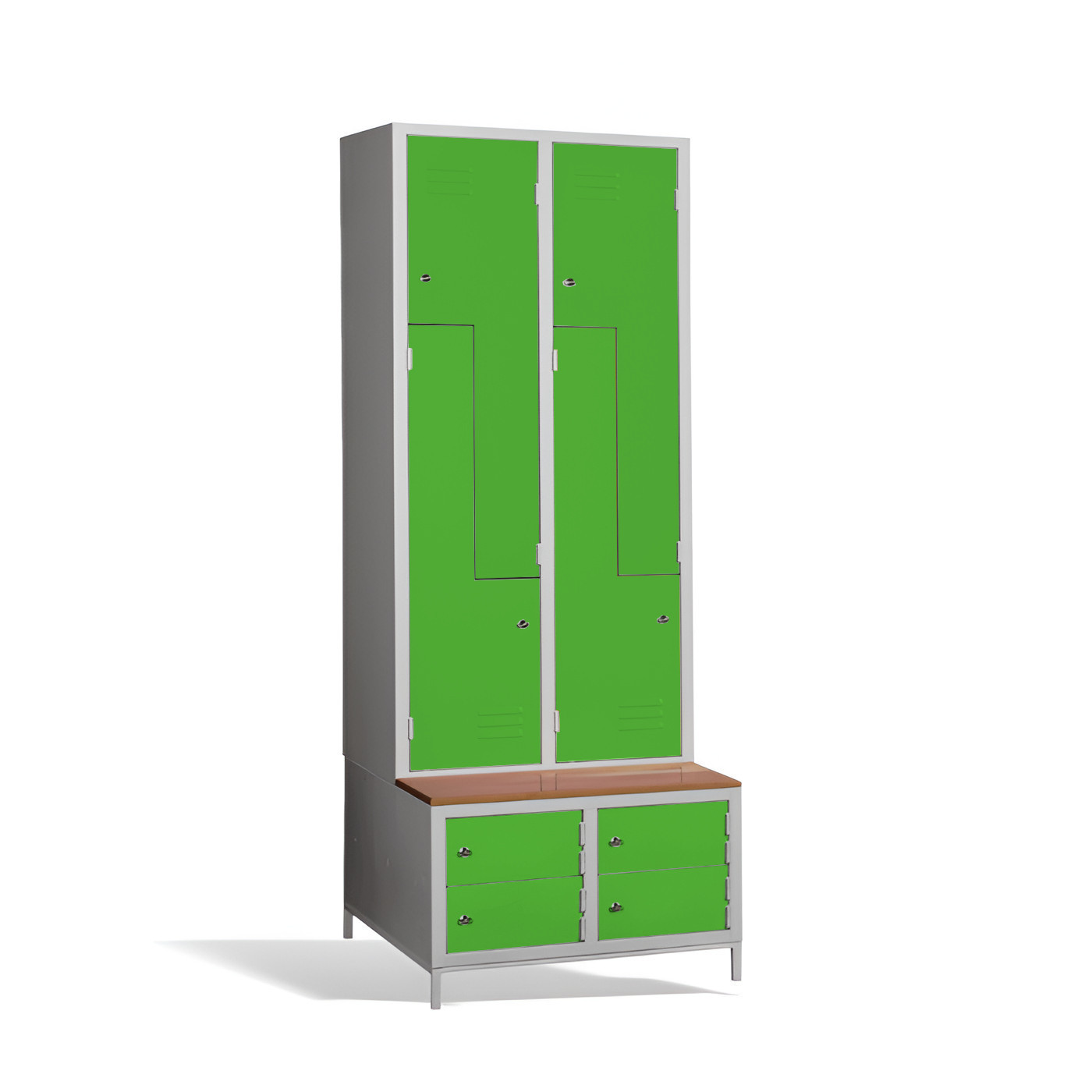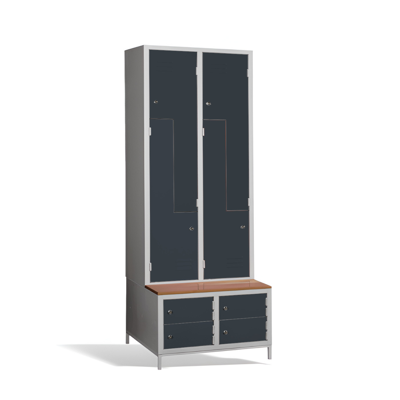 Čtyřdveřová šatní skříň ve tvaru Z s vestavěnou lavicí a skříňkami na boty je ideálním řešením pro šatnu. Je to nejpohodlnější řešení, které zajistí pohodlí a pořádek v šatně. Konstrukce skříně je svařovaná, vyrobená z kvalitního ocelového plechu s povrchovou úpravou třídy 1. Konstrukce šatní skříně ve tvaru písmene Z je prostorově úsporná, a přitom poskytuje dostatečný komfort. Tato skříňka je ideální volbou pro šatnu ve škole, podniku nebo sportovním zařízení. Skříňka #03 CIK-CAK MAXI 4 PLUS je standardně dodávána s bezpečnostním cylindrickým zámkem, ale můžete si vybrat z různých typů zámků podle svých potřeb.