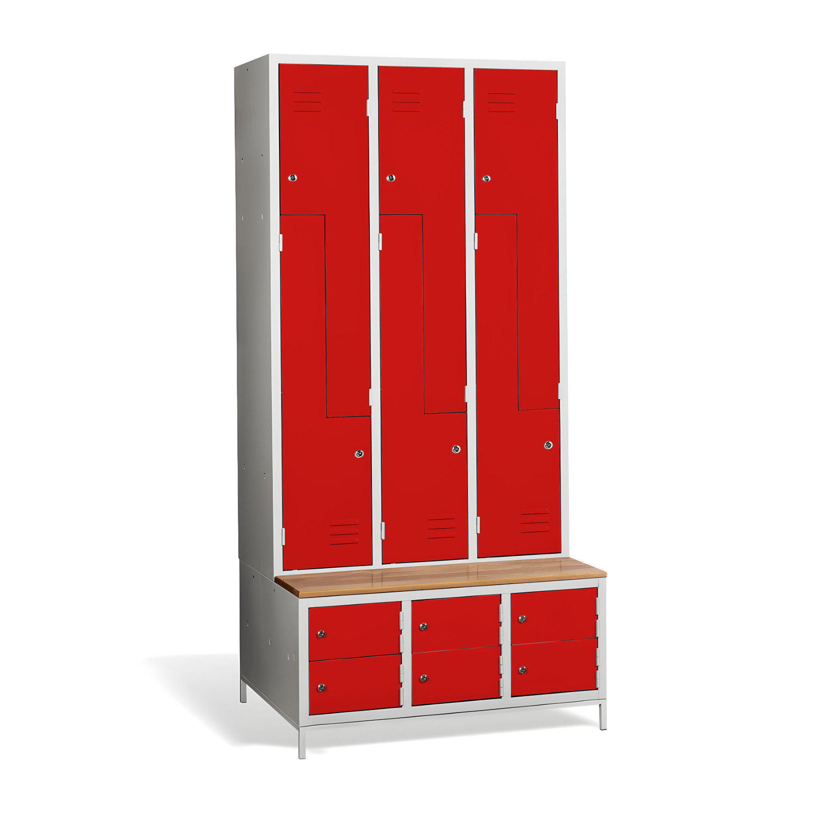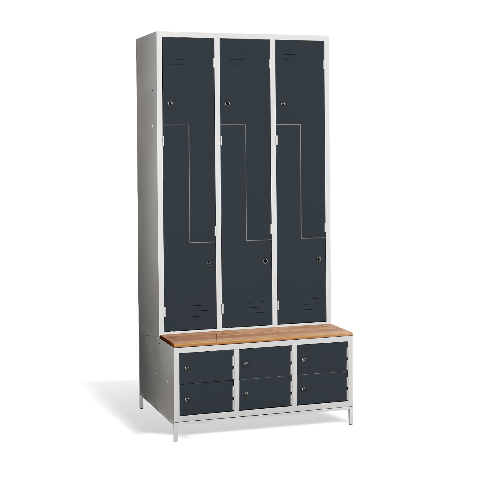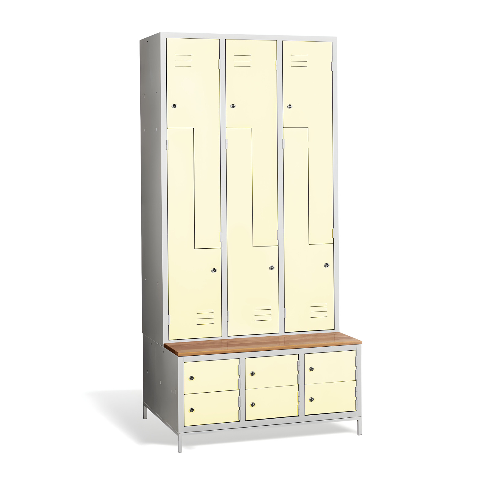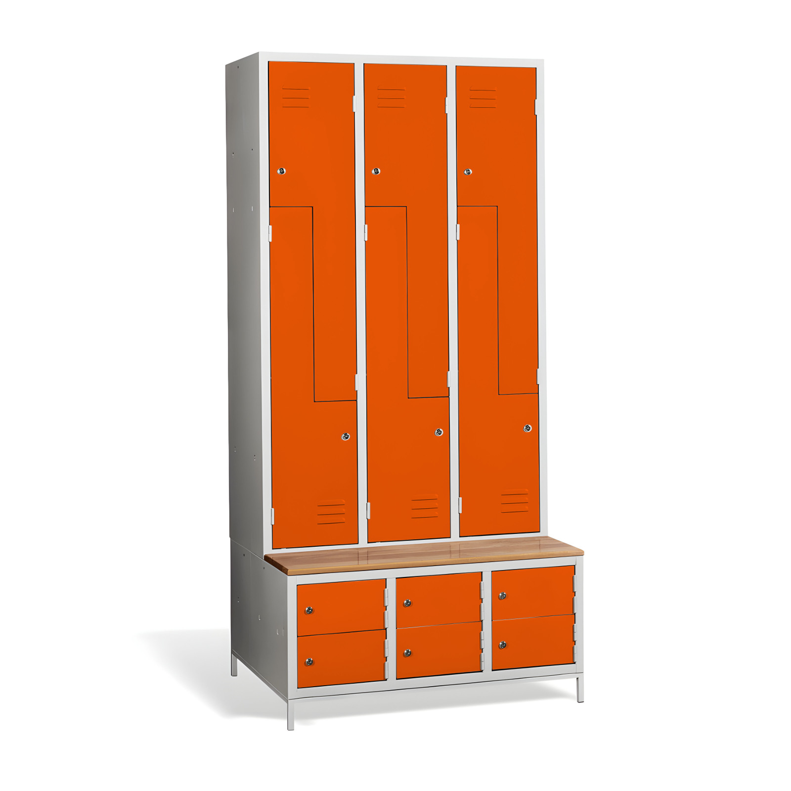 Kovová šatní skříň #03 CIK-CAK MINI 6 PLUS nabízí řešení 3 v 1. Obsahuje úložný prostor pro vaše osobní věci a kabáty v podobě 6 přihrádek, nabízí prostor pro vaše boty s skříňky botníky a je vybavena vestavěnou lavicí pro vaše pohodlí. Konstrukce skříně je svařovaná, vyrobená z kvalitního ocelového plechu s povrchovou úpravou třídy 1. Konstrukce šatní skříně ve tvaru písmene Z je prostorově úsporná, a přitom poskytuje dostatek pohodlí. Tato skříňka je ideální volbou pro šatnu ve škole, podniku nebo sportovním zařízení. Skříňka #03 CIK-CAK MINI 6 PLUS je standardně dodávána s bezpečnostním cylindrickým zámkem, ale můžete si vybrat z různých typů zámků podle svých potřeb.