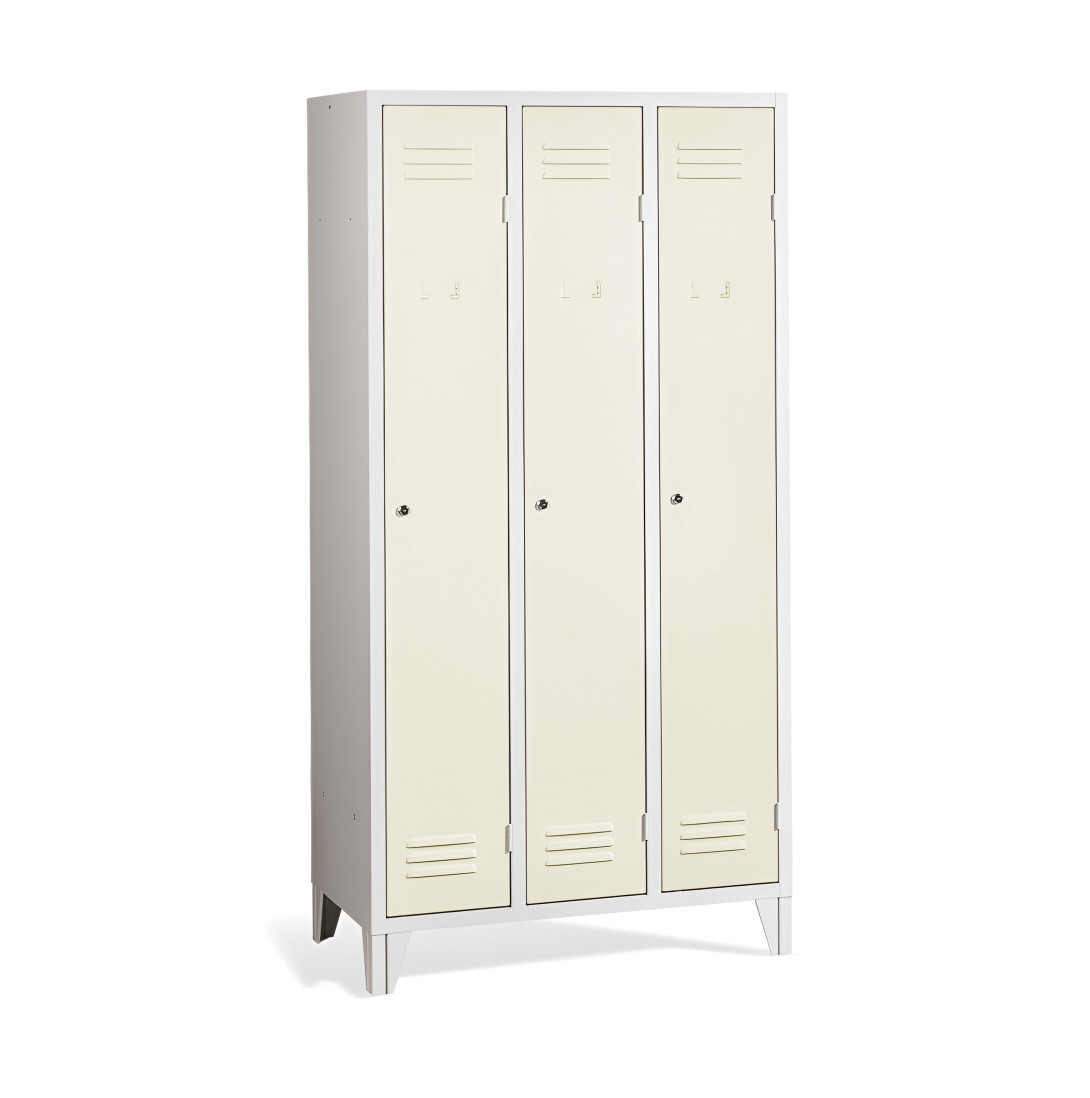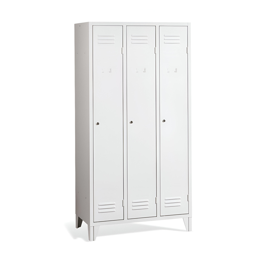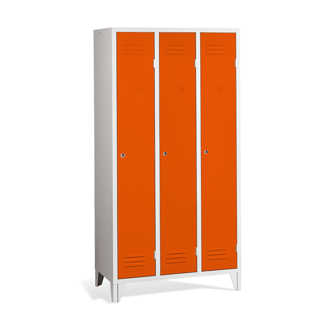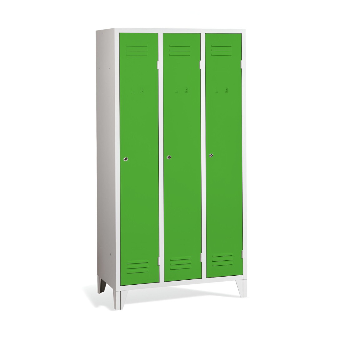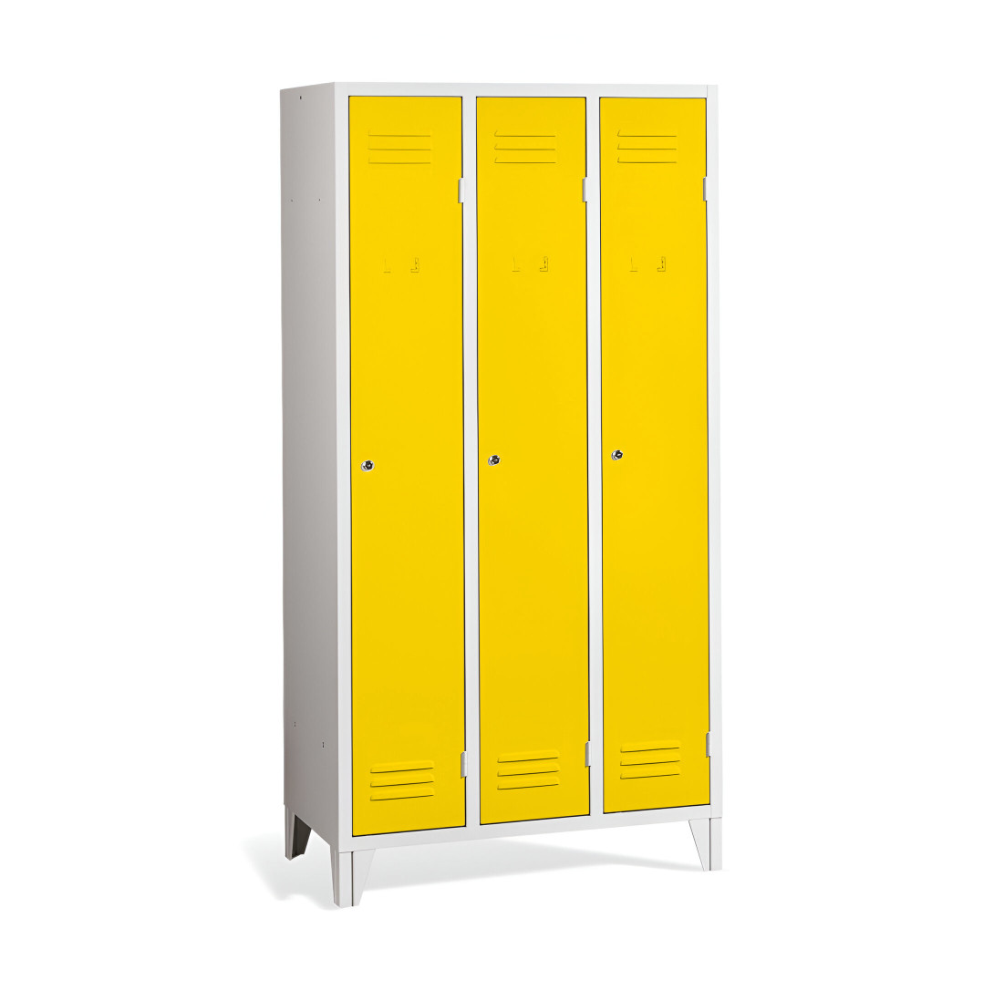 3-dveřová šatní skříň s nožičkami #26 STANDARD 3 ECONOMY F je cenově dostupným řešením pro školy, firmy i jiné instituce. Má dlouhá dvířka, díky čemuž poskytuje dostatečné místo pro Vaše kabáty, boty i osobní předměty. Je vyrobena z kvalitního ocelového plechu 1. třídy s povrchovou úpravou, což zajišťuje její dlouhou životnost. Větrací otvory v horní i dolní části dveří zajišťují efektivní proudění vzduchu a odvádzají pach. Nožičky mají výšku 120 mm, což umožňuje pohodlný úklid pod skříňkami. Standardně ji dodáváme s bezpečnostním cylindrickým zámkem, ale můžete si vybrat z různých typů zámků dle vlastního přání.