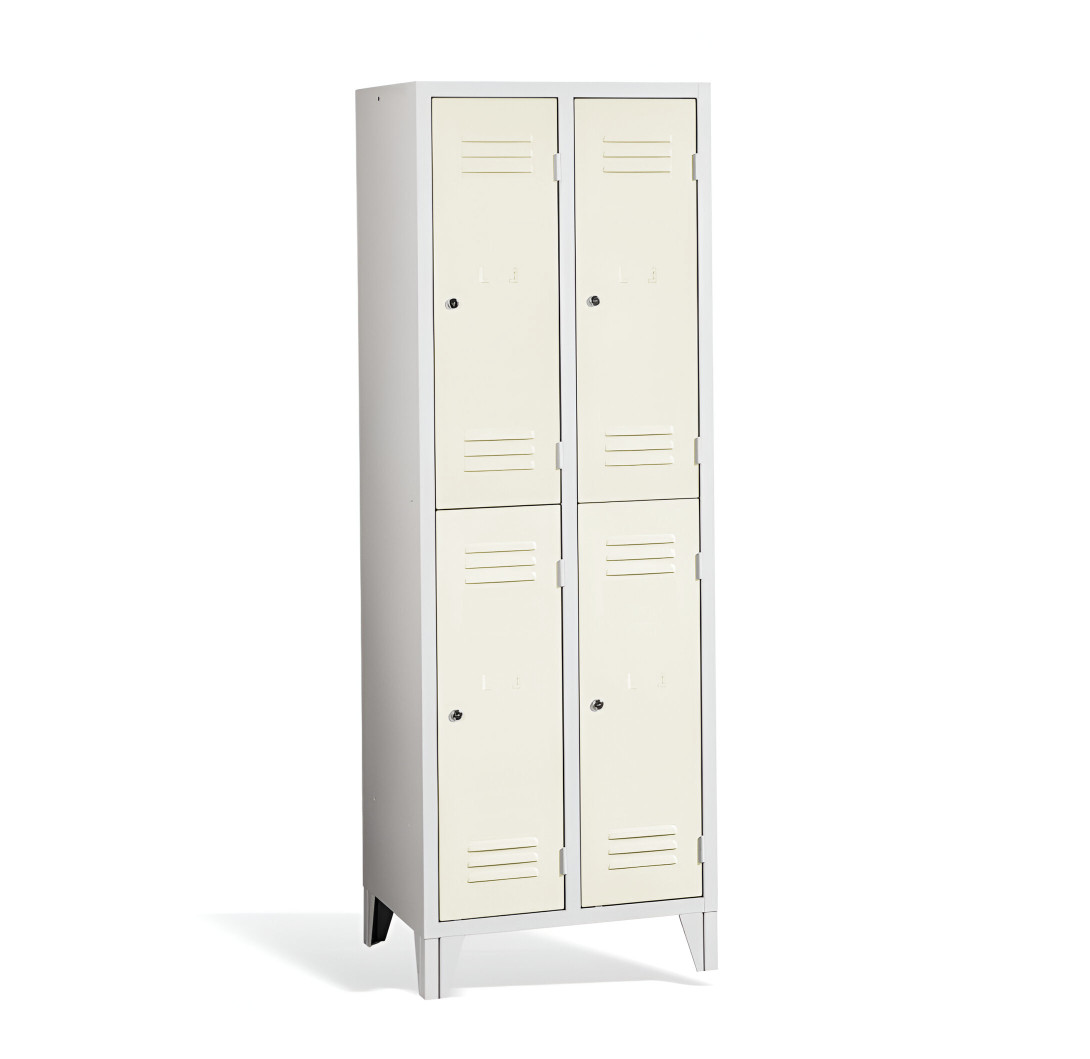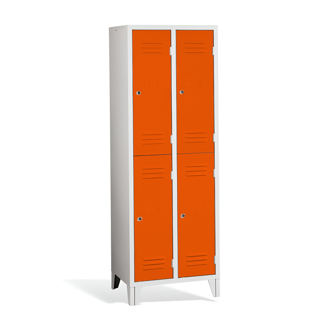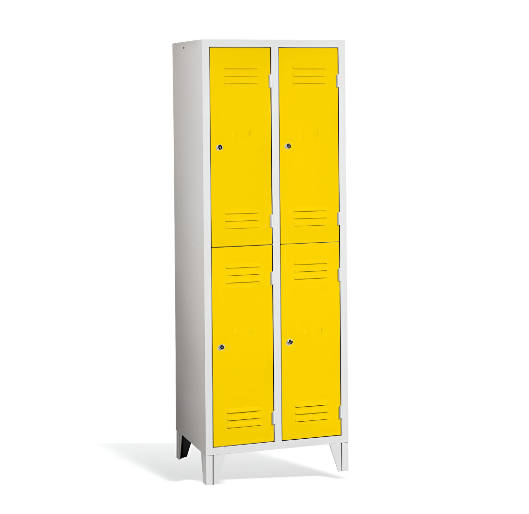4-dveřová šatní skříň s krátkými dveřmi a nožičkami #26 MINI 4 ECONOMY F je cenově dostupným řešením pro školy, firmy i jiné instituce. Obsahuje až 4 odkládacích prostor pro 4 osoby, přičemž zabírá jen málo místa. Poskytuje dostatek místa pro vaše kabáty, boty i osobní předměty. Je vyrobena z kvalitního ocelového plechu 1. třídy s povrchovou úpravou, což zajišťuje její dlouhou životnost. Větrací otvory v horní i dolní části dveří zajišťují efektivní proudění vzduchu a odvádějí pach. Nožičky mají výšku 120 mm, což umožňuje pohodlný úklid pod skříňkami. Standardně ji dodáváme s bezpečnostním cylindrickým zámkem, ale můžete si vybrat z různých typů zámků dle vlastního přání.