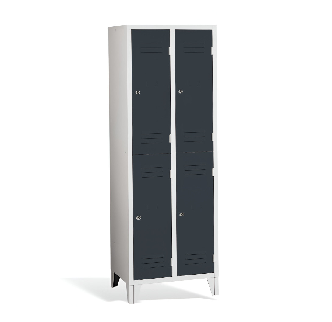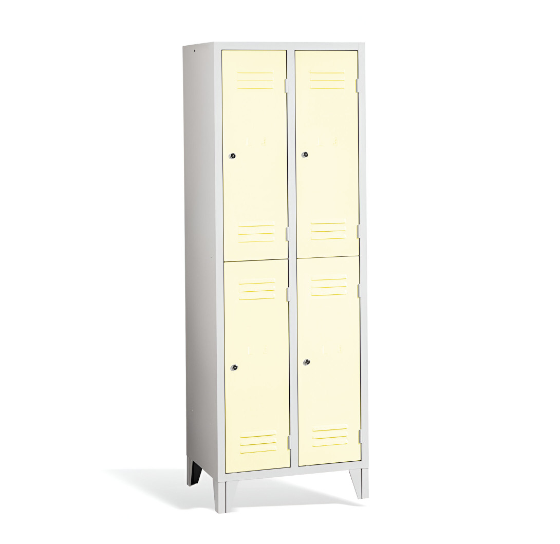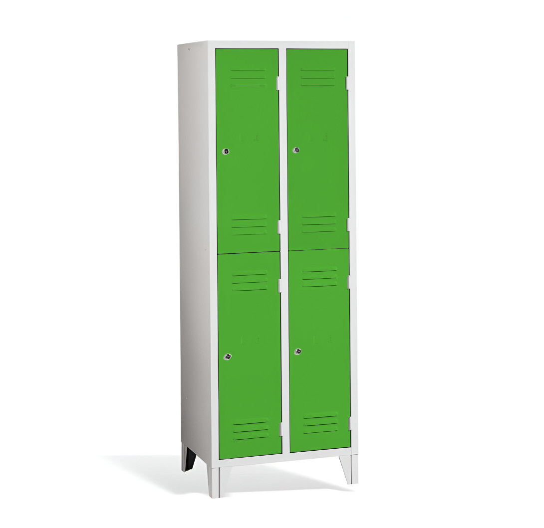 4-dveřová šatní skříň s krátkými dveřmi a nožičkami #26 MINI 4 ECONOMY F je cenově dostupným řešením pro školy, firmy i jiné instituce. Obsahuje až 4 odkládacích prostor pro 4 osoby, přičemž zabírá jen málo místa. Poskytuje dostatek místa pro vaše kabáty, boty i osobní předměty. Je vyrobena z kvalitního ocelového plechu 1. třídy s povrchovou úpravou, což zajišťuje její dlouhou životnost. Větrací otvory v horní i dolní části dveří zajišťují efektivní proudění vzduchu a odvádějí pach. Nožičky mají výšku 120 mm, což umožňuje pohodlný úklid pod skříňkami. Standardně ji dodáváme s bezpečnostním cylindrickým zámkem, ale můžete si vybrat z různých typů zámků dle vlastního přání.