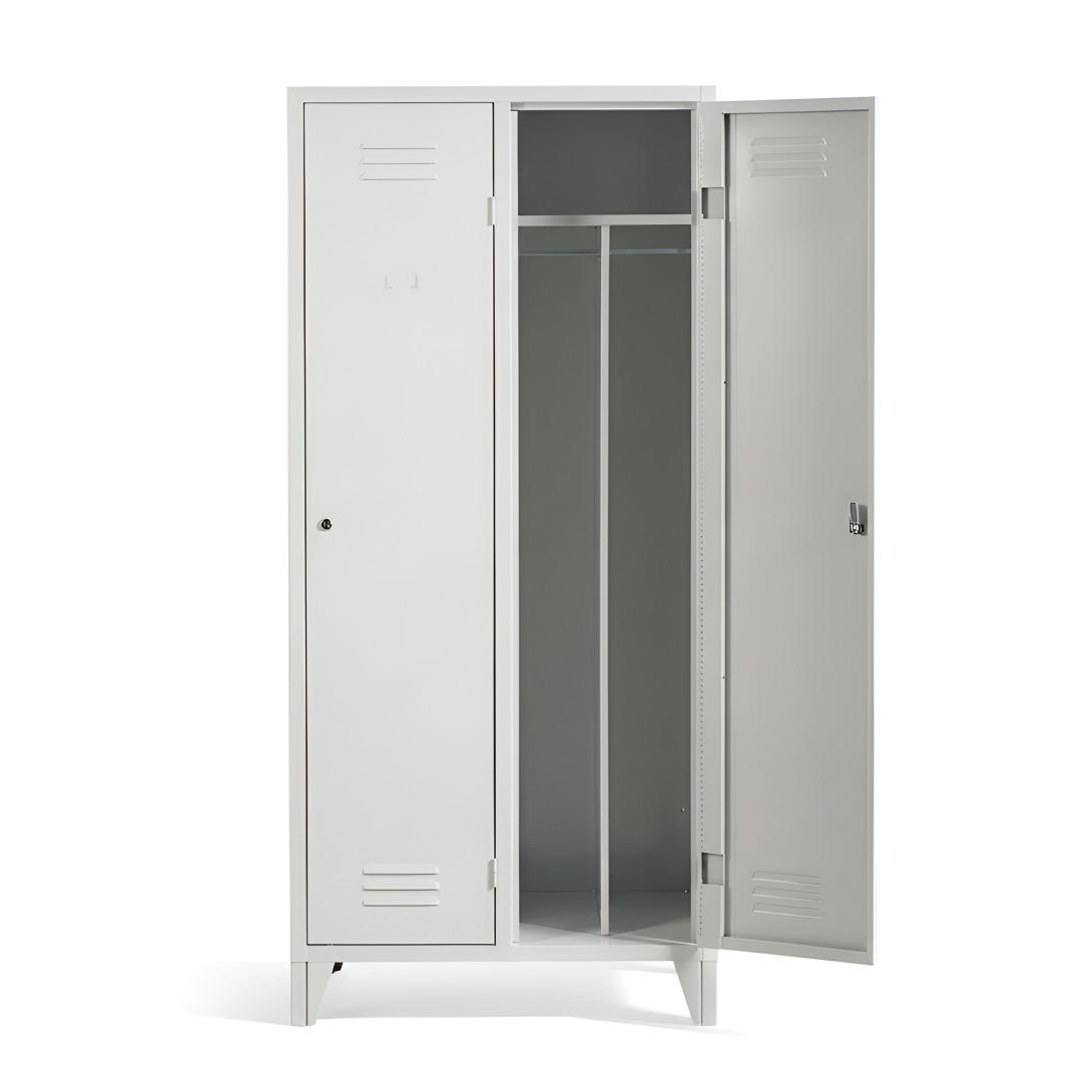 Skříň je rozdělena na dvě samostatné přihrádky. Každá přihrádka obsahuje dělící přepážku, která umožňuje oddělit pracovní a čisté oblečení, čímž pomáhá udržovat lepší pořádek a hygienu při ukládání oděvů.