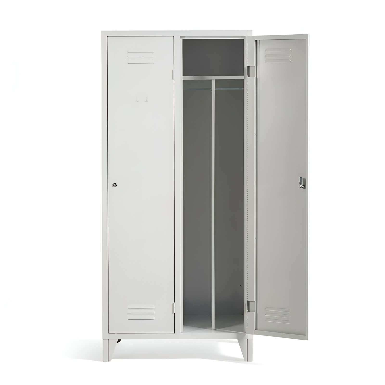 Skříň je rozdělena na dvě samostatné přihrádky. Každá přihrádka obsahuje dělící přepážku, která umožňuje oddělit pracovní a čisté oblečení, čímž pomáhá udržovat lepší pořádek a hygienu při ukládání oděvů.