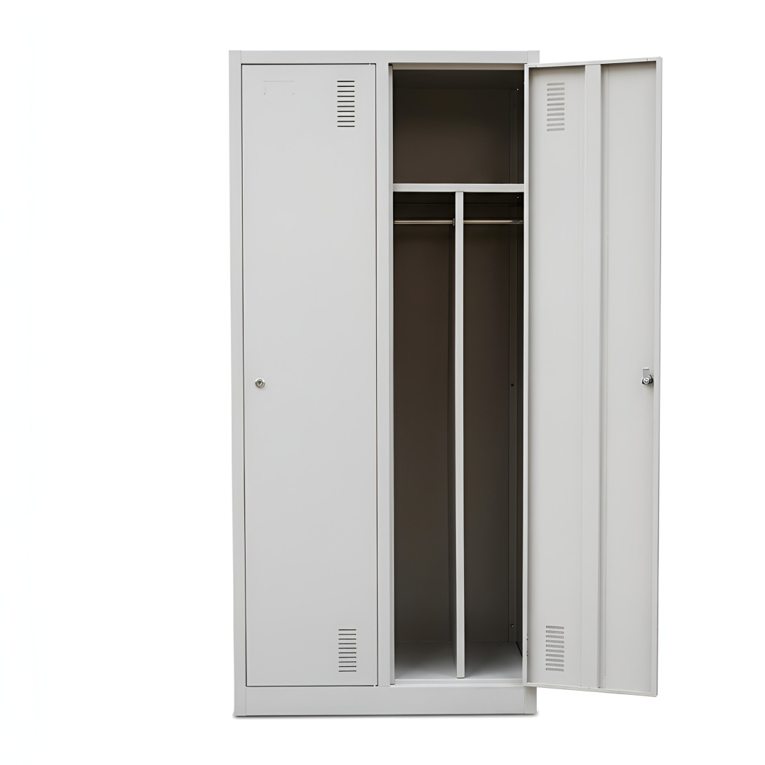 Skříň je rozdělena na dvě samostatné přihrádky, přičemž každá z nich obsahuje dělící přepážku pro oddělení čistého a pracovního oblečení. Takové řešení pomáhá udržovat hygienu a pořádek při ukládání oděvů.