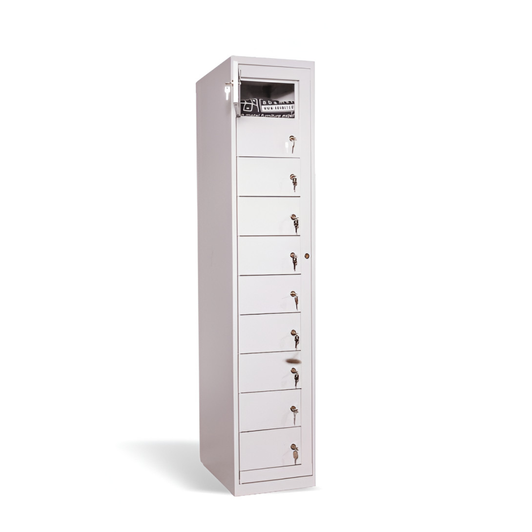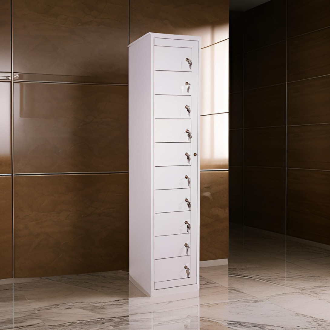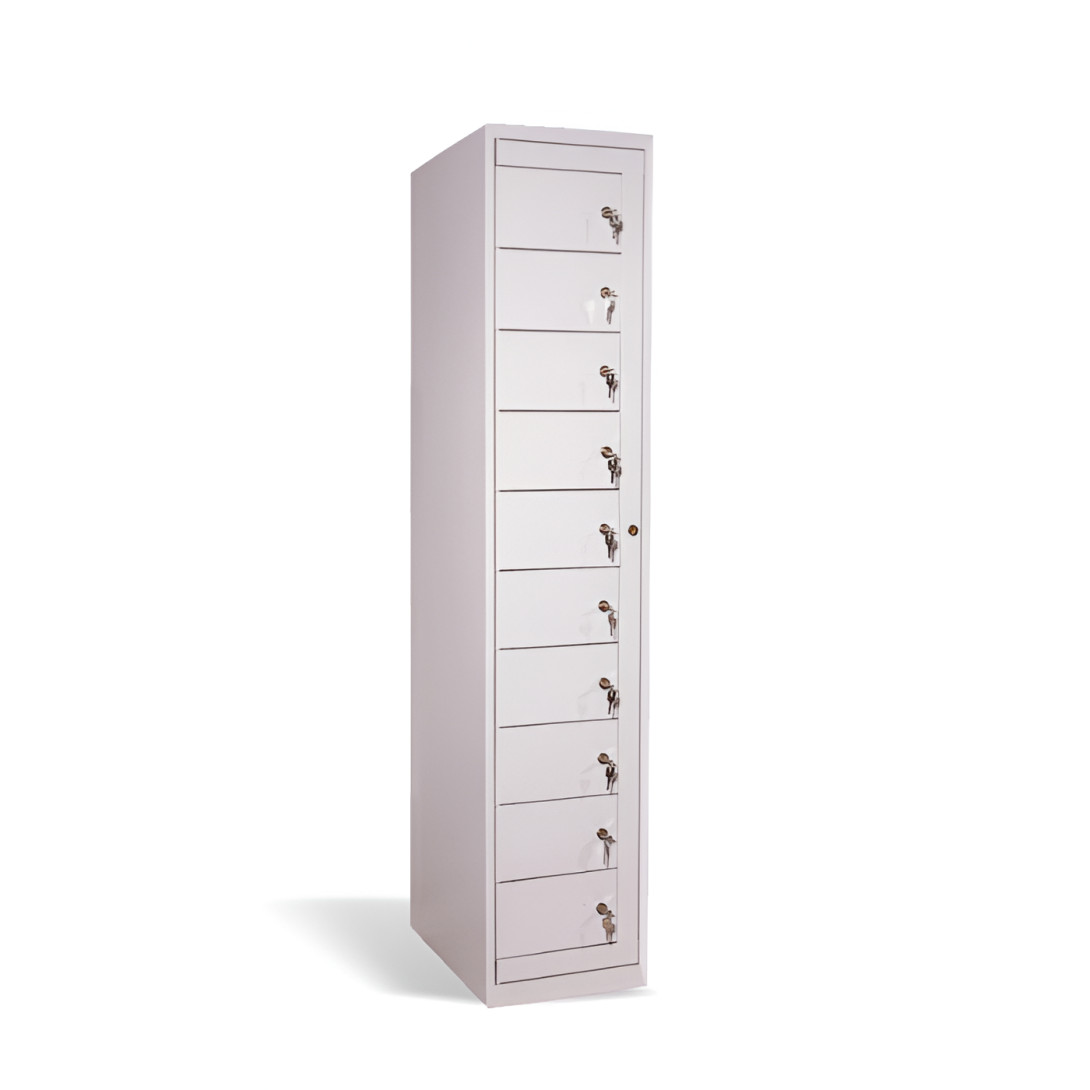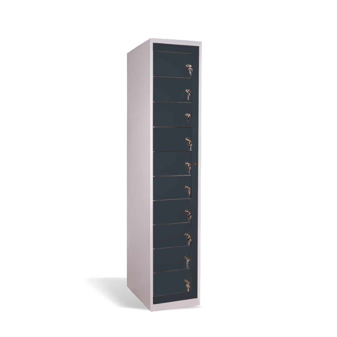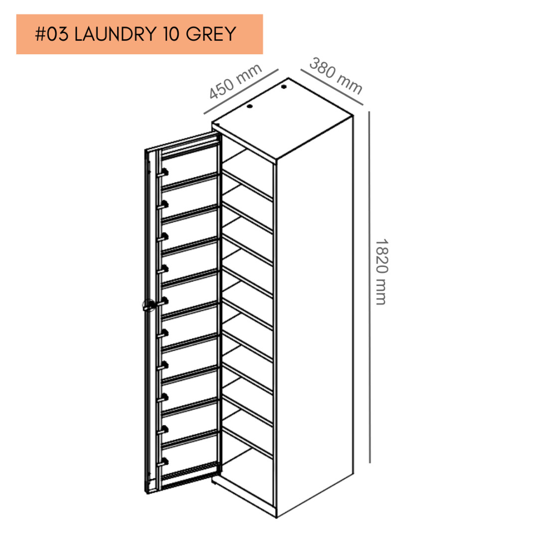 Skříň č. 03 LAUNDRY 10 GREY je určena pro výdej čistých pracovních oděvů. Díky skříňkám do prádelny se výdej a sběr oděvů stává jednoduchou a snadno zvládnutelnou záležitostí. Skříňka obsahuje 10 přihrádek. Každá přihrádka obsahuje cylindrický zámek se 2 klíči. Zaměstnanci, kteří používají konkrétní přihrádku a mohou otevřít pouze tu svou. Zaměstnanec pověřený výdejem a sběrem pracovních oděvů používá pouze 1 klíč, a to k ovládání celého systému. Skříňka je vhodná do výroby, do školy, všude tam, kde je třeba převlékat a odevzdávat pracovní oděvy.