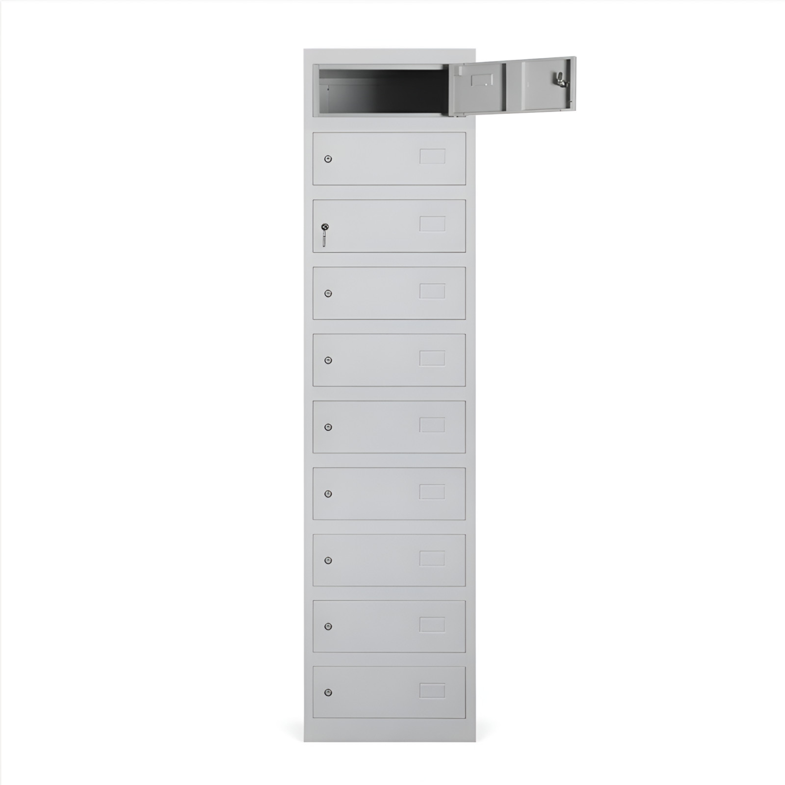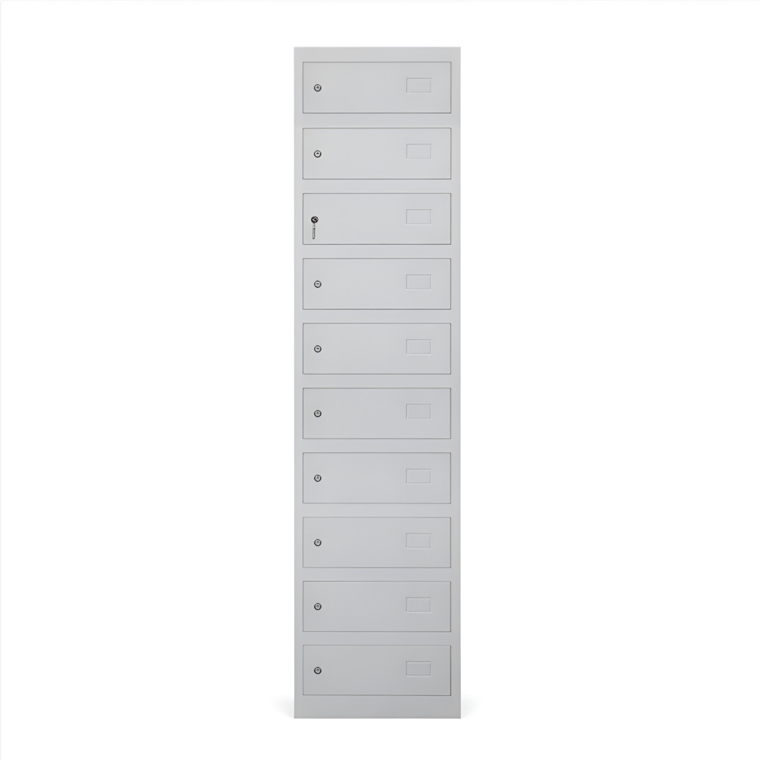 Skříň obsahuje 10 samostatných přihrádek, které poskytují oddělený prostor pro uložení cenností více uživatelů. Takové řešení je vhodné zejména do prostředí, kde je potřeba zajistit bezpečné a organizované uskladnění osobních věcí.