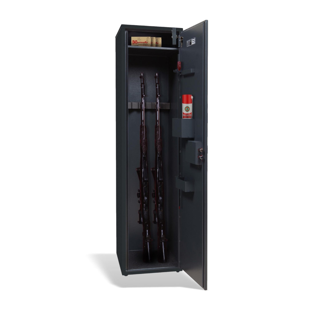 Skříně nebo trezory na zbraně jsou určeny pro bezpečné uskladnění zbraní, jsou dostupné ve více barvách a velikostech. Pro střelce a myslivce je to idální volba. Skříně na zbraně se vyznačují vysokou kvalitou, spolehlivostí a cenovou dostupností. Jejich speciální pevná konstrukce nabízí ochranu proti vloupání, kterou zajistí tzv. „spojky“. Obsahuje vnitřní závěs anti-cut proti proříznutí. Možnost ukotvení do podlahy a stěny.