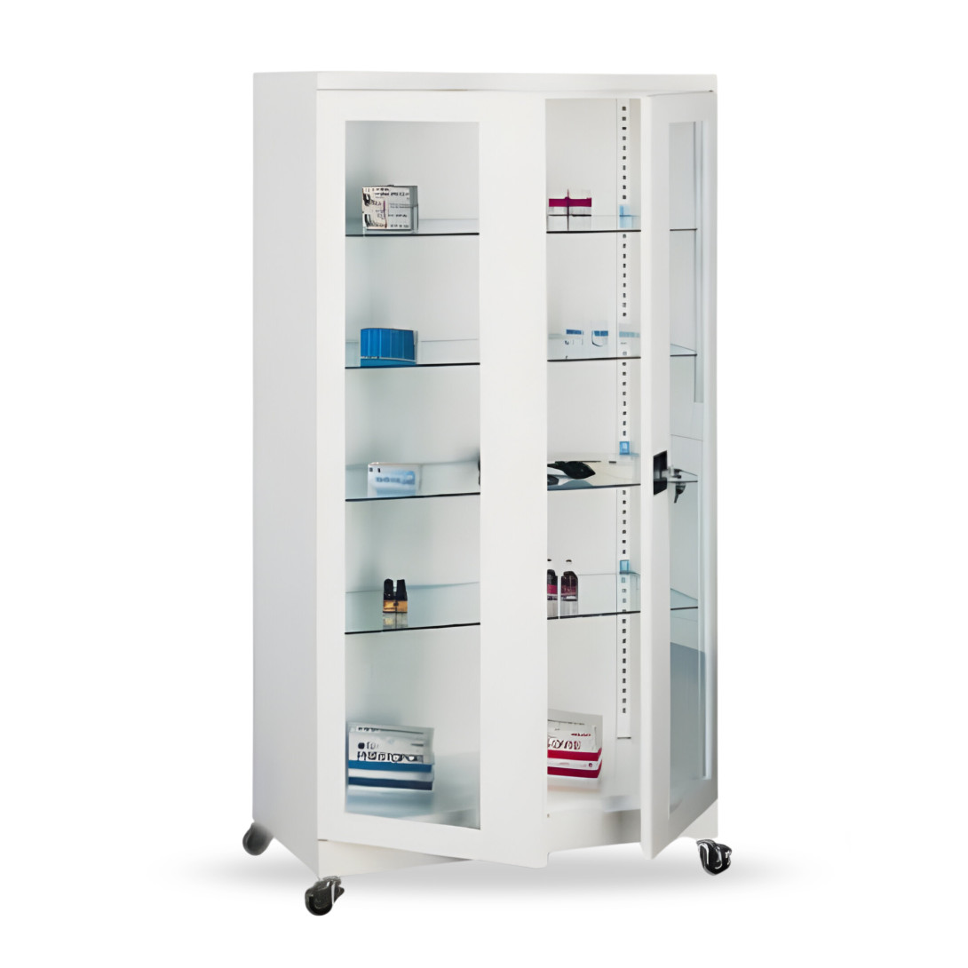 Nemocniční skříňka na léky #26 MEDICINE MAXI GLASS ECONOMY je vybavena 4 skleněnými policemi a kolečky pro snazší manipulaci. Dveře jsou prosklené. Skříň je vhodná do ordinací, do nemocnic, lékáren, do kosmetického salonu. Vitrína je zajištěna dvoubodovým zámkem, se dvěma klíči v ceně.