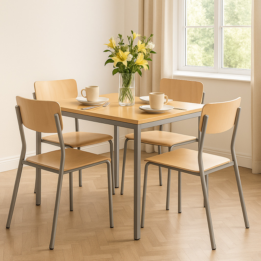 Konstrukce stolu se skládá z ocelového rámu s odolnou práškovou povrchovou úpravou a laminované desky v odstínu buk. Díky tomu se hodí nejen do domácností, ale také do konferenčních prostor či školních zařízení. Dodáváme jej kompletně smontovaný, připravený k okamžitému použití, a v případě potřeby jej vyneseme až do patra.