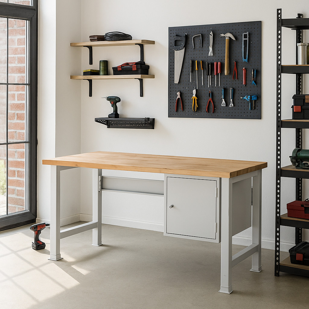 Tento odolný pracovní stůl je ideálním řešením pro dílny, výrobu či servisní prostory, kde je důležitá pevnost, flexibilita a praktický úložný prostor. Buková pracovní deska o tloušťce 40 mm a délce 1500 mm poskytuje stabilní plochu, která zvládne i náročné úkoly. Stabilitu a dlouhou životnost zajišťují nastavitelné kovové nohy z ocelového plechu (2,5 – 3,0 mm), které umožňují přizpůsobit výšku stolu podle potřeb uživatele a zajistit pohodlné pracovní podmínky.