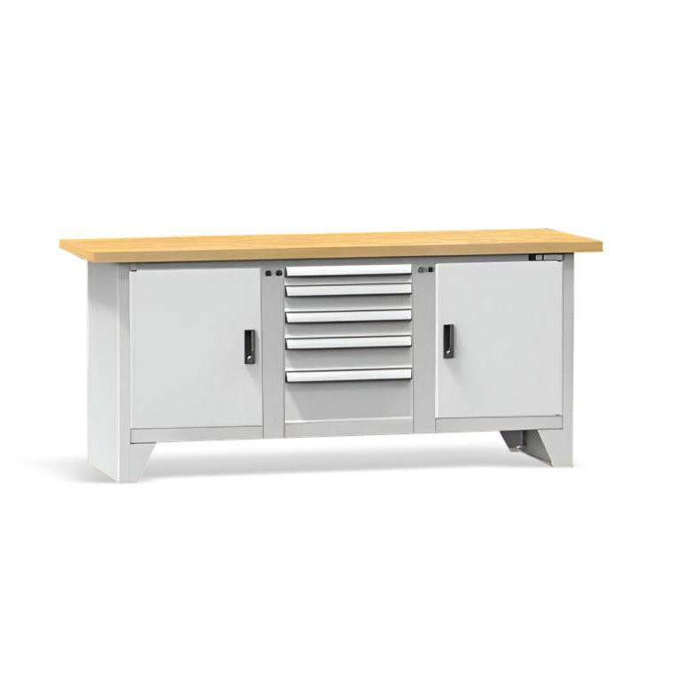 Pracovní stůl #29 HARDWORK EXTRA SC5D s nosností do 800 kg je velmi praktický pomocník v dílně a při řemeslných činnostech. Tvoří jej ocelová konstrukce a pracovní deska vyrobená z kvalitního bukového dřeva o tloušťce 40 mm. Pod pracovní deskou se nacházejí 3 moduly. Na levé a pravé straně uzamykatelná skříňka se 2 policemi. Ve středu naleznete zásuvkový modul s 5 zásuvkami. Zásuvky se otevírají centrálním zámkem, ke kterému patří 2 klíče. Pracovní stůl o délce 2000 mm je jednoduchý a čistý, přitom praktický a variabilní. Pracovní stůl je dodáván v demontu. Pokud si přejete, abychom zajistili i montáž, prosíme vložte do košíku položku "Montáž pracovního stolu", která se zobrazuje po přidání produktu do košíku.